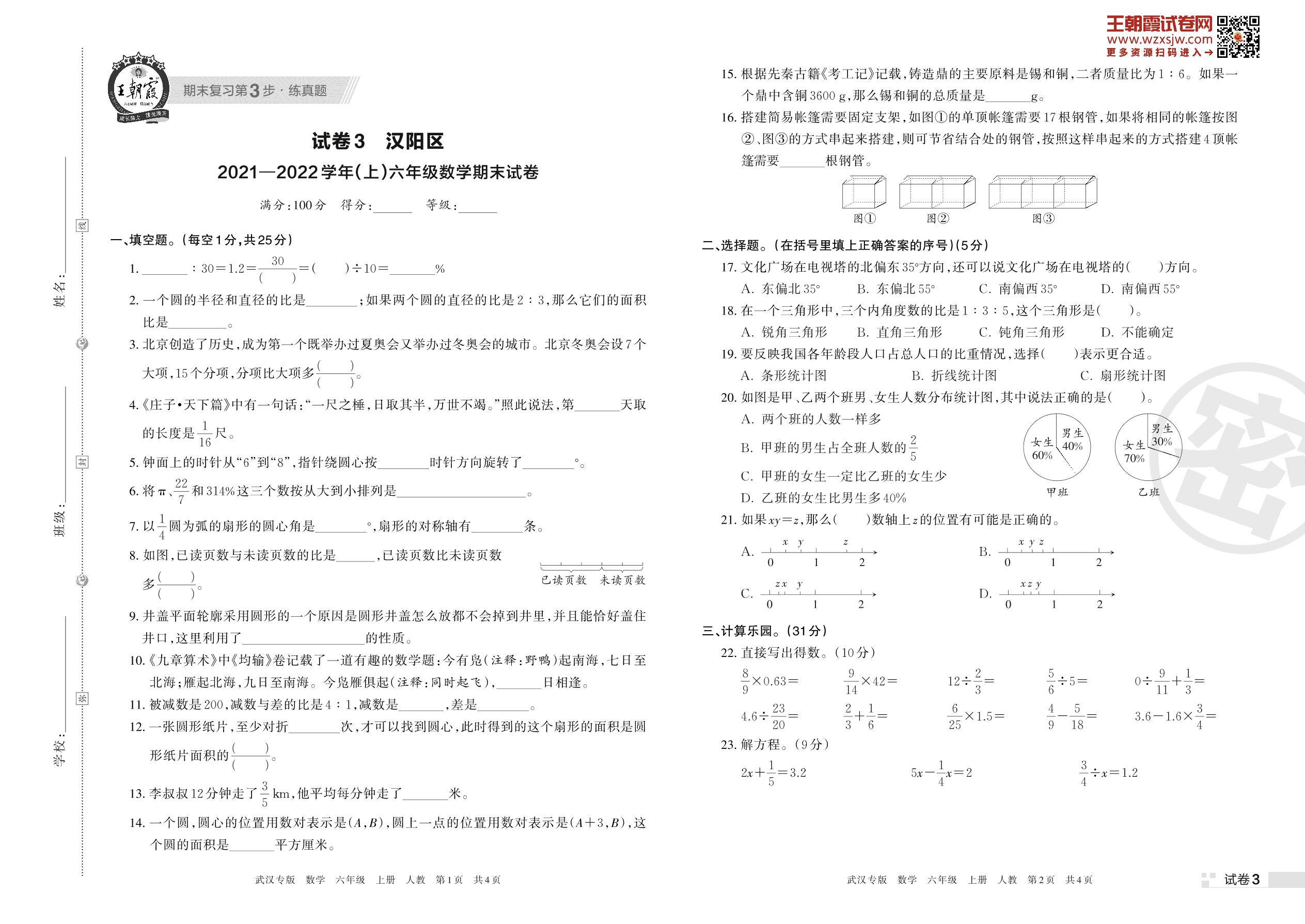 汉阳区2021—2022学年(上)六年级数学期末试卷(人教版)【3】