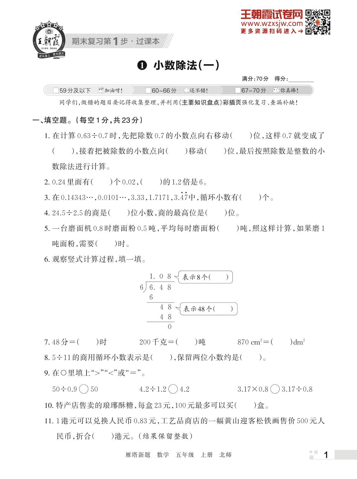 王朝霞期末过课本——1 小数除法(一)五年级上册数学(北师版)_R221123163003398