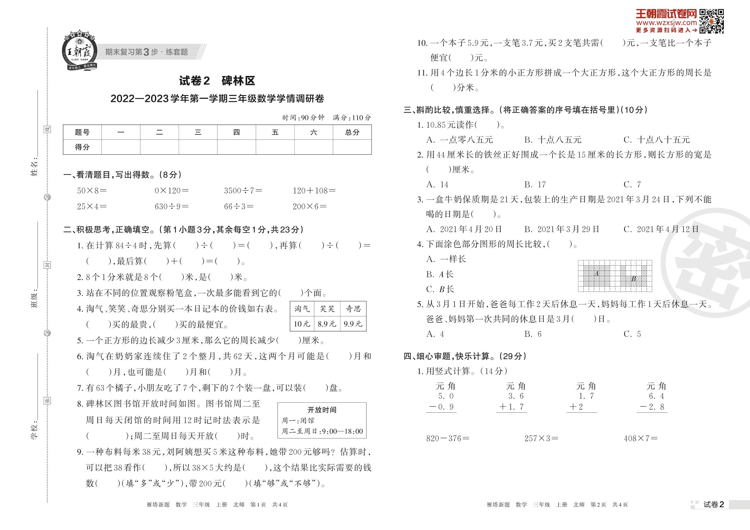 碑林区2022—2023学年第一学期学情调研卷三年级上册数学(北师版)【2】
