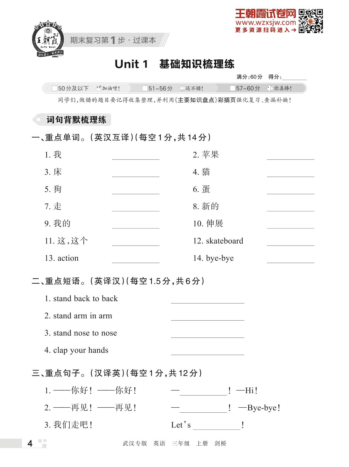 王朝霞期末过课本——Unit 1 基础知识梳理练三年级上册英语(剑桥版)