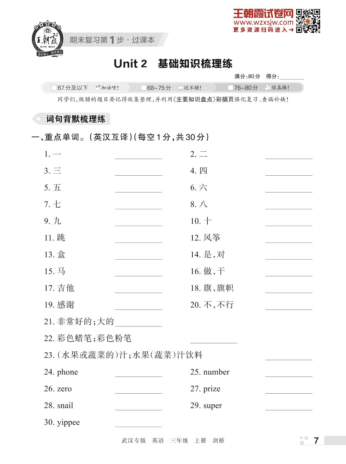 王朝霞期末过课本——Unit 2 基础知识梳理练三年级上册英语(剑桥版)