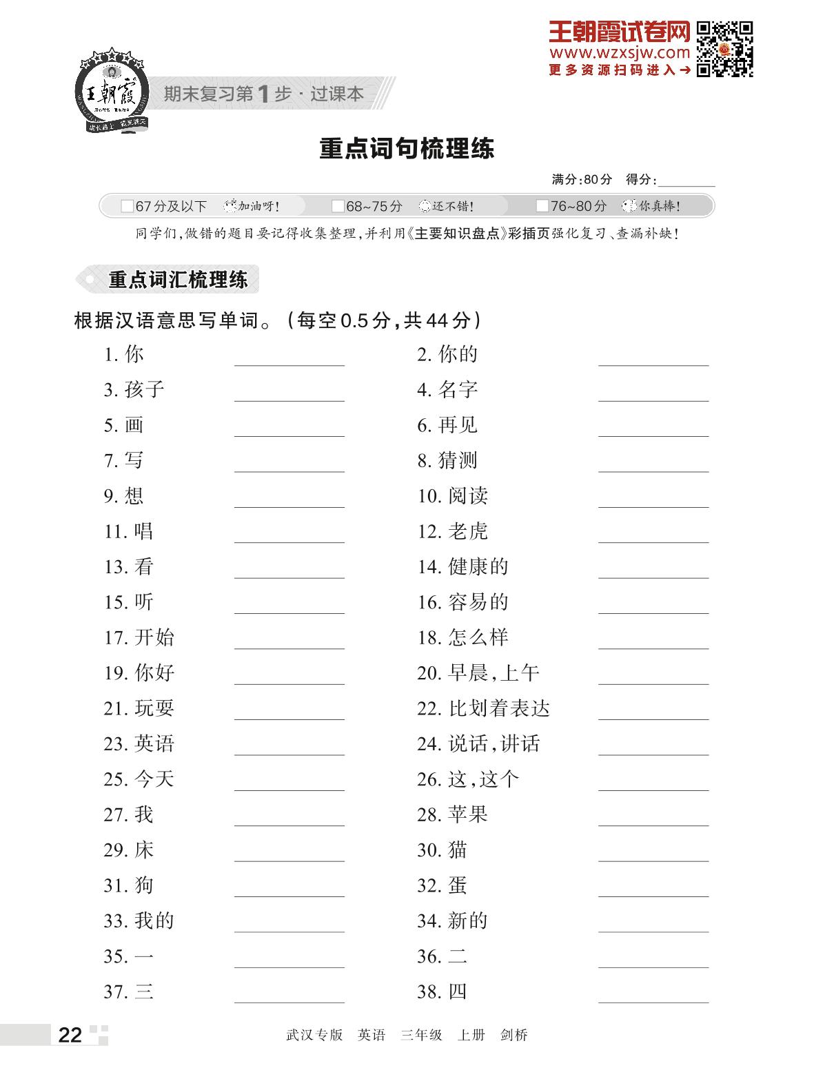 王朝霞期末过课本——重点词句梳理练三年级上册英语(剑桥版)
