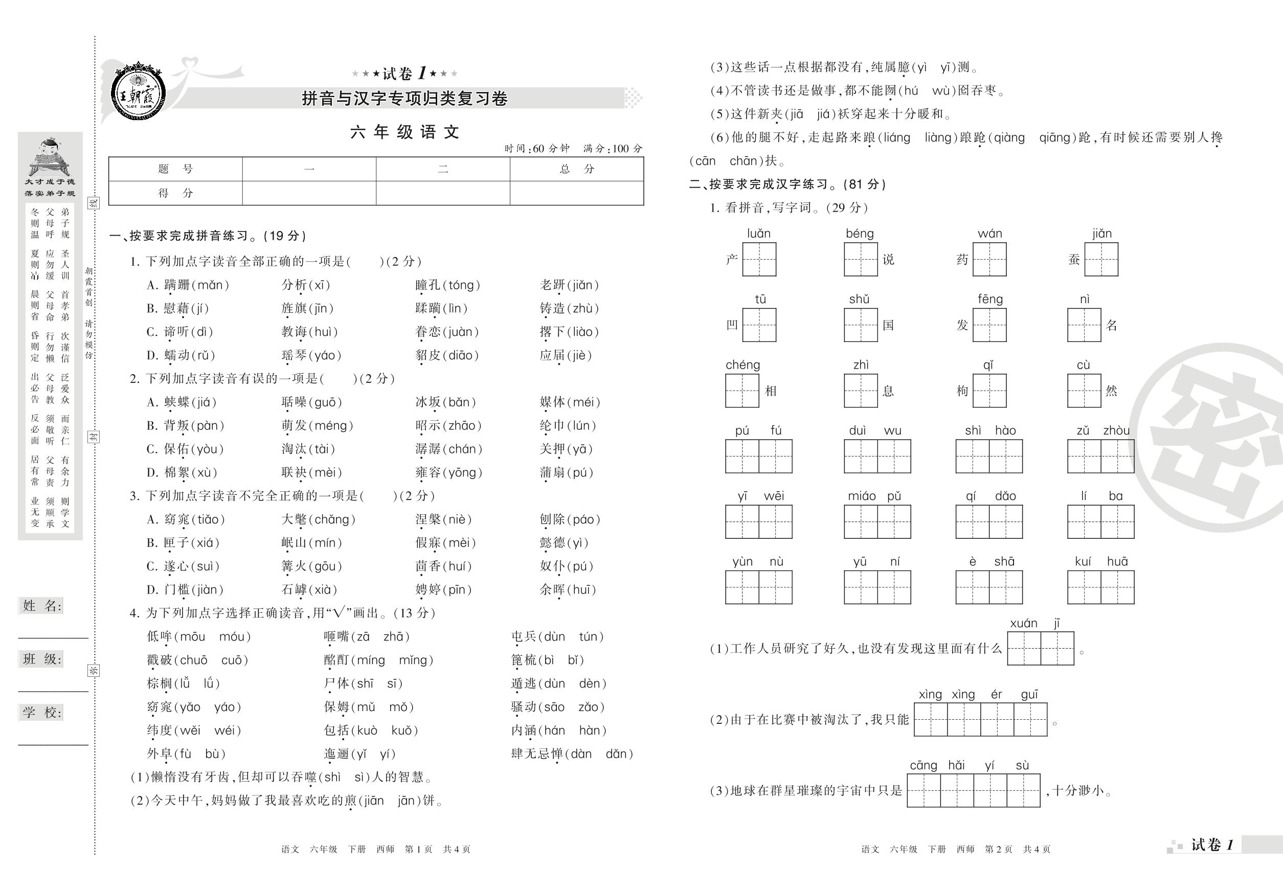 王朝霞期末专项卷——拼音与汉字专项归类复习卷六年级下册语文(西师版)_R210802115649【1】