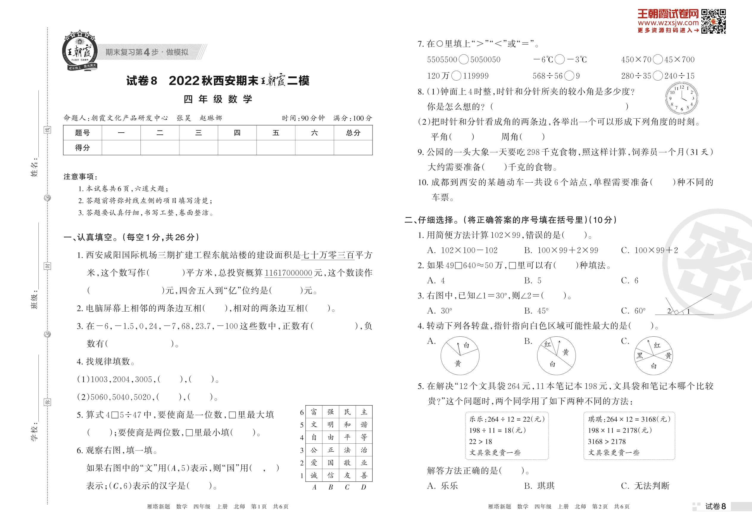 王朝霞期末模拟卷四年级上册数学(北师版)_R221123170016566【8】