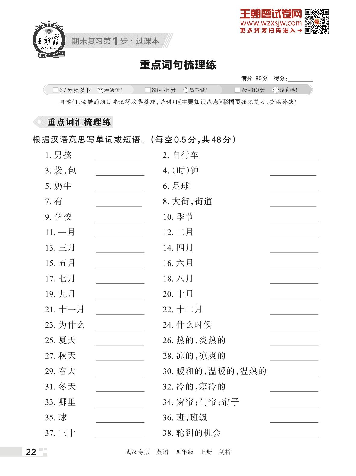 王朝霞期末过课本——重点词句梳理练四年级上册英语(剑桥版)