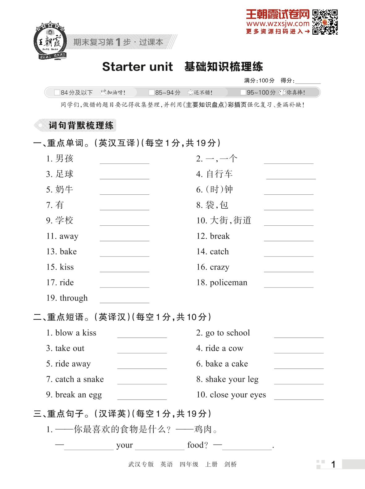 王朝霞期末过课本——Starter unit 基础知识梳理练四年级上册英语(剑桥版)