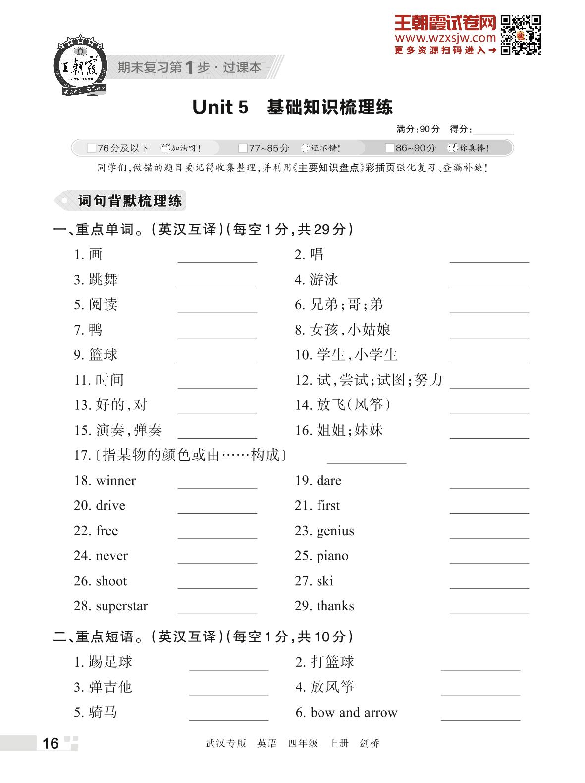 王朝霞期末过课本——Unit 5 基础知识梳理练四年级上册英语(剑桥版)