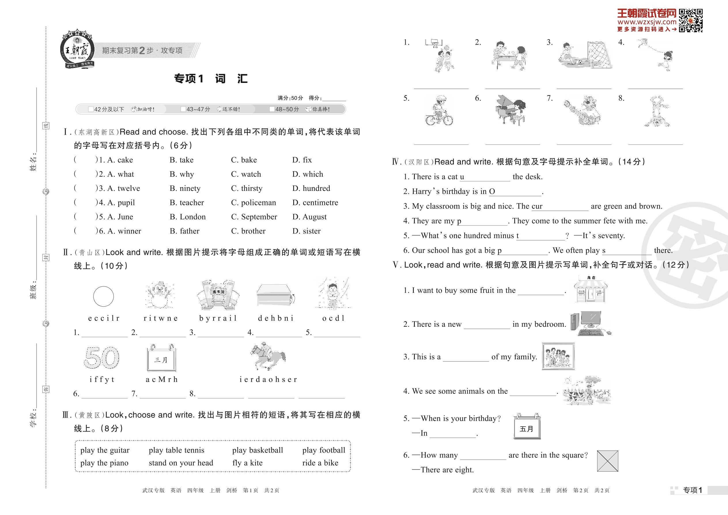 王朝霞期末专项卷——词汇四年级上册英语(剑桥版)【1】