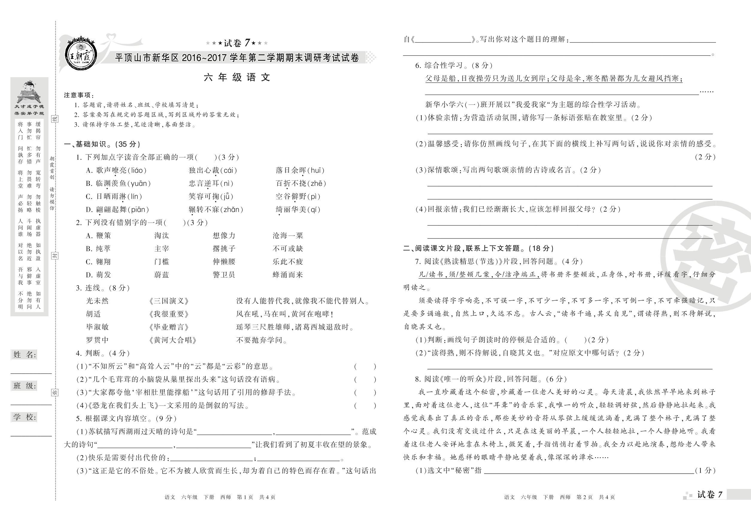 2016-2017学年第二学期平顶山市新华区六年级语文试卷(西师版)【7】