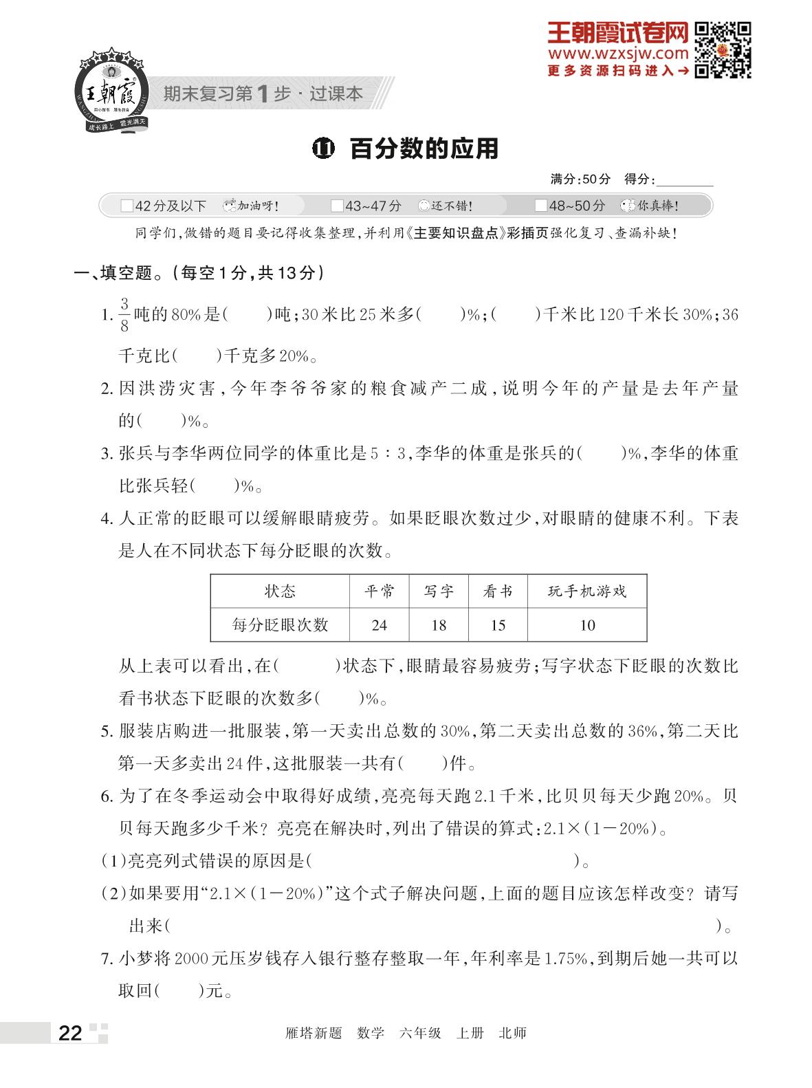 王朝霞期末过课本——11 百分数的应用六年级上册数学(北师版)_R221123170917380