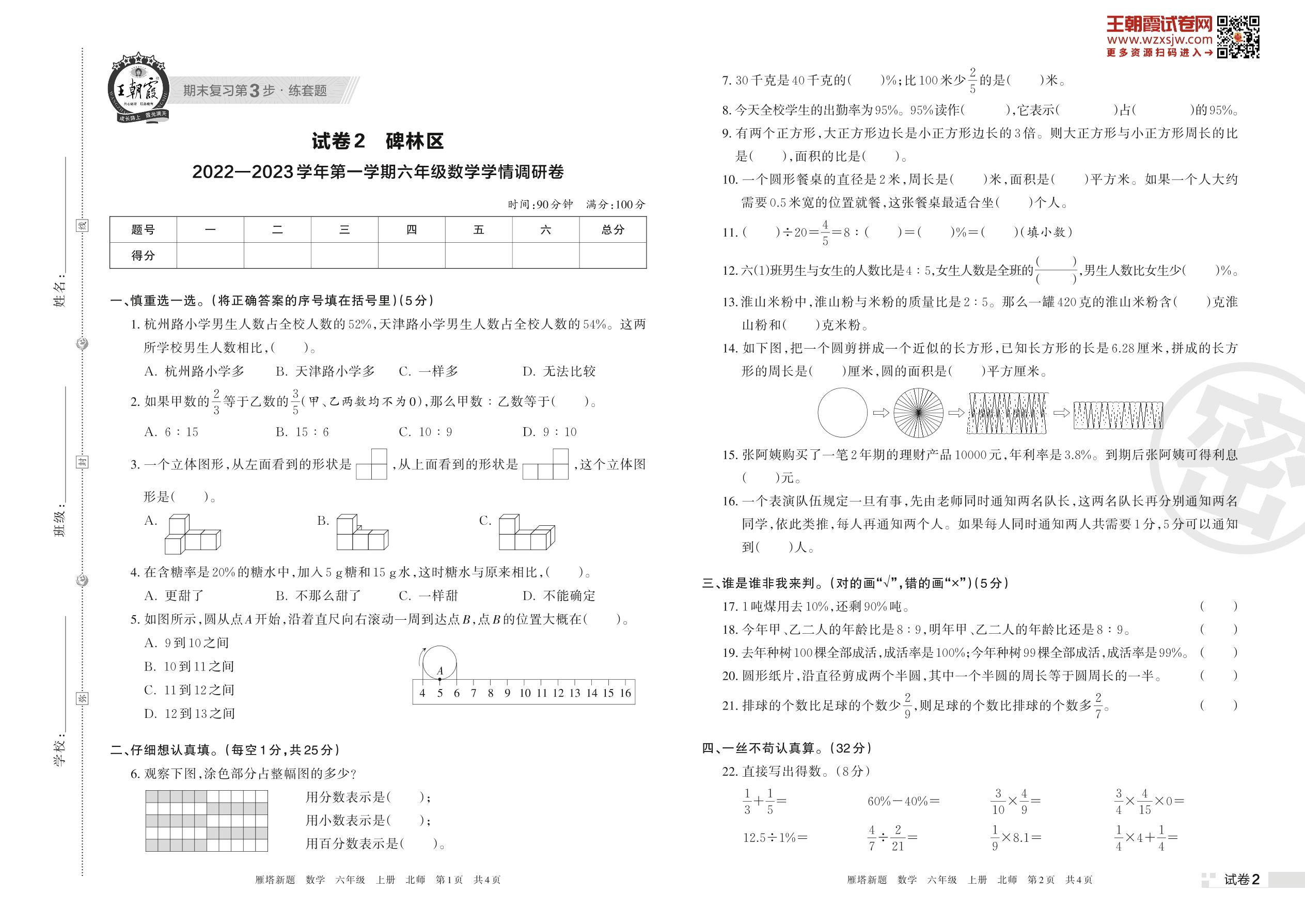 碑林区2022—2023学年第一学期学情调研卷六年级上册数学(北师版)【2】