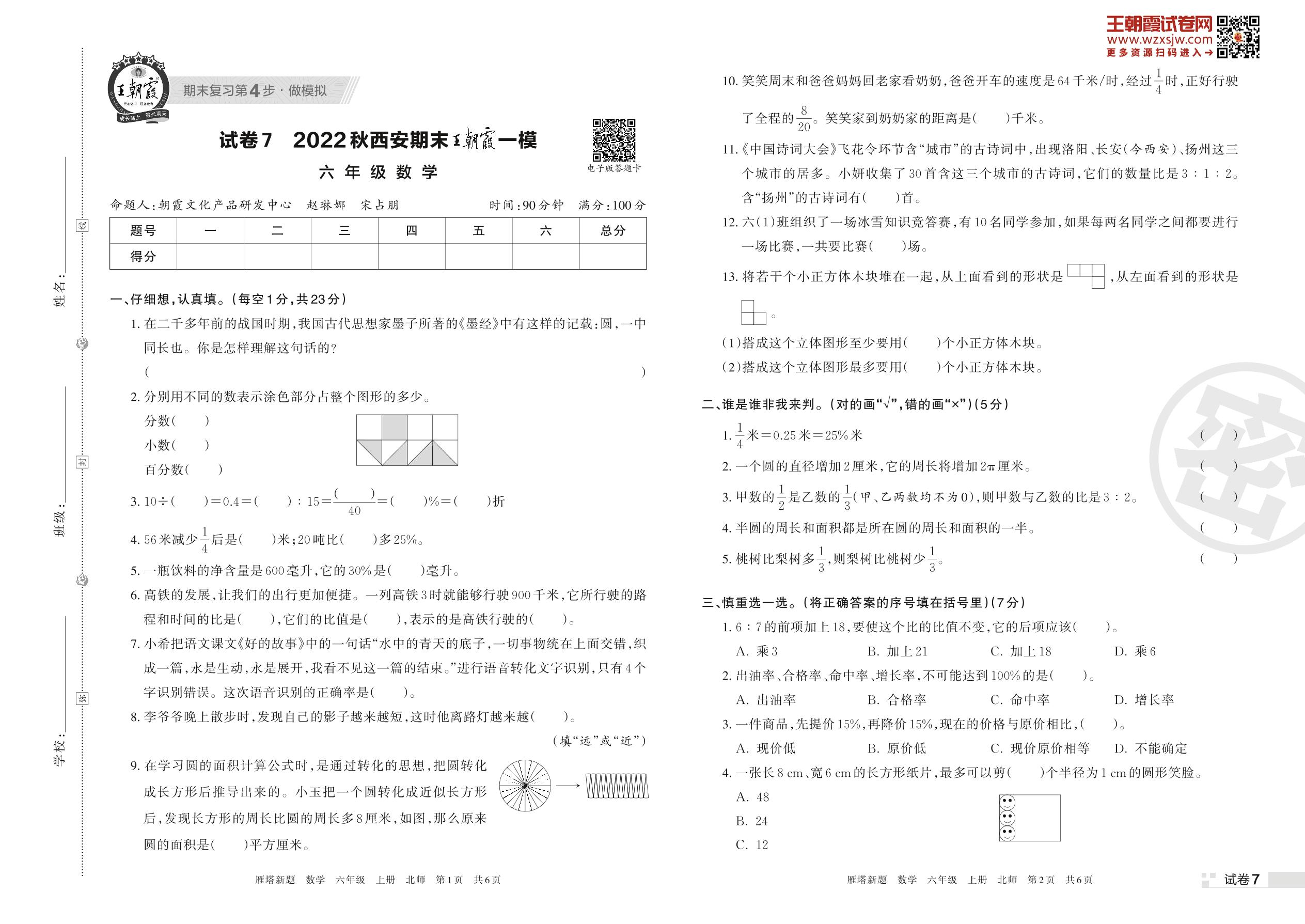 王朝霞期末模拟卷六年级上册数学(北师版)_R221123171121457【7】