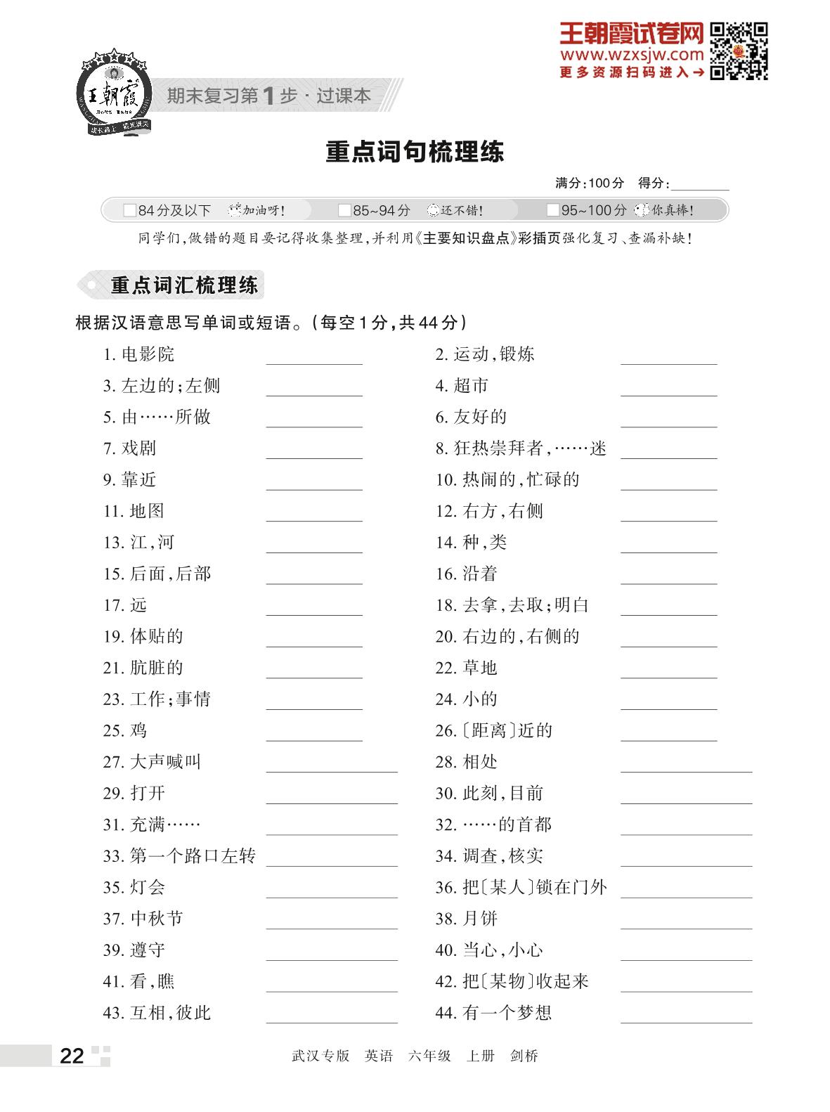王朝霞期末过课本——重点词句梳理练六年级上册英语(剑桥版)