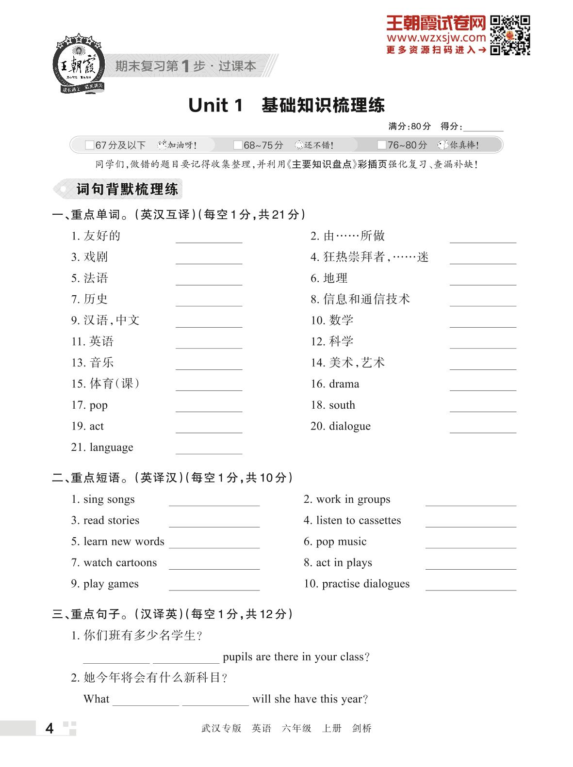 王朝霞期末过课本——Unit 1 基础知识梳理练六年级上册英语(剑桥版)