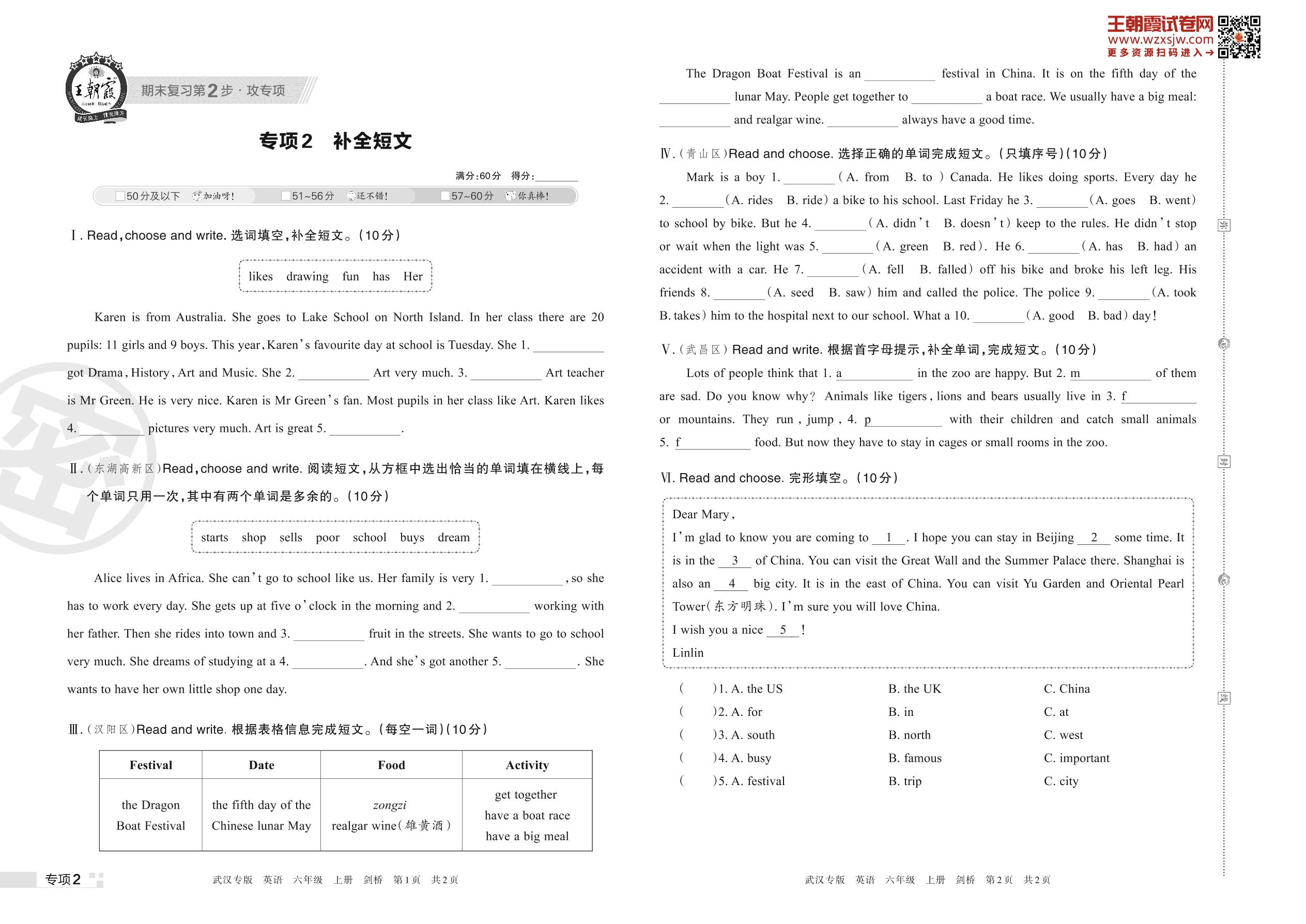 王朝霞期末专项卷——补全短文六年级上册英语(剑桥版)【2】