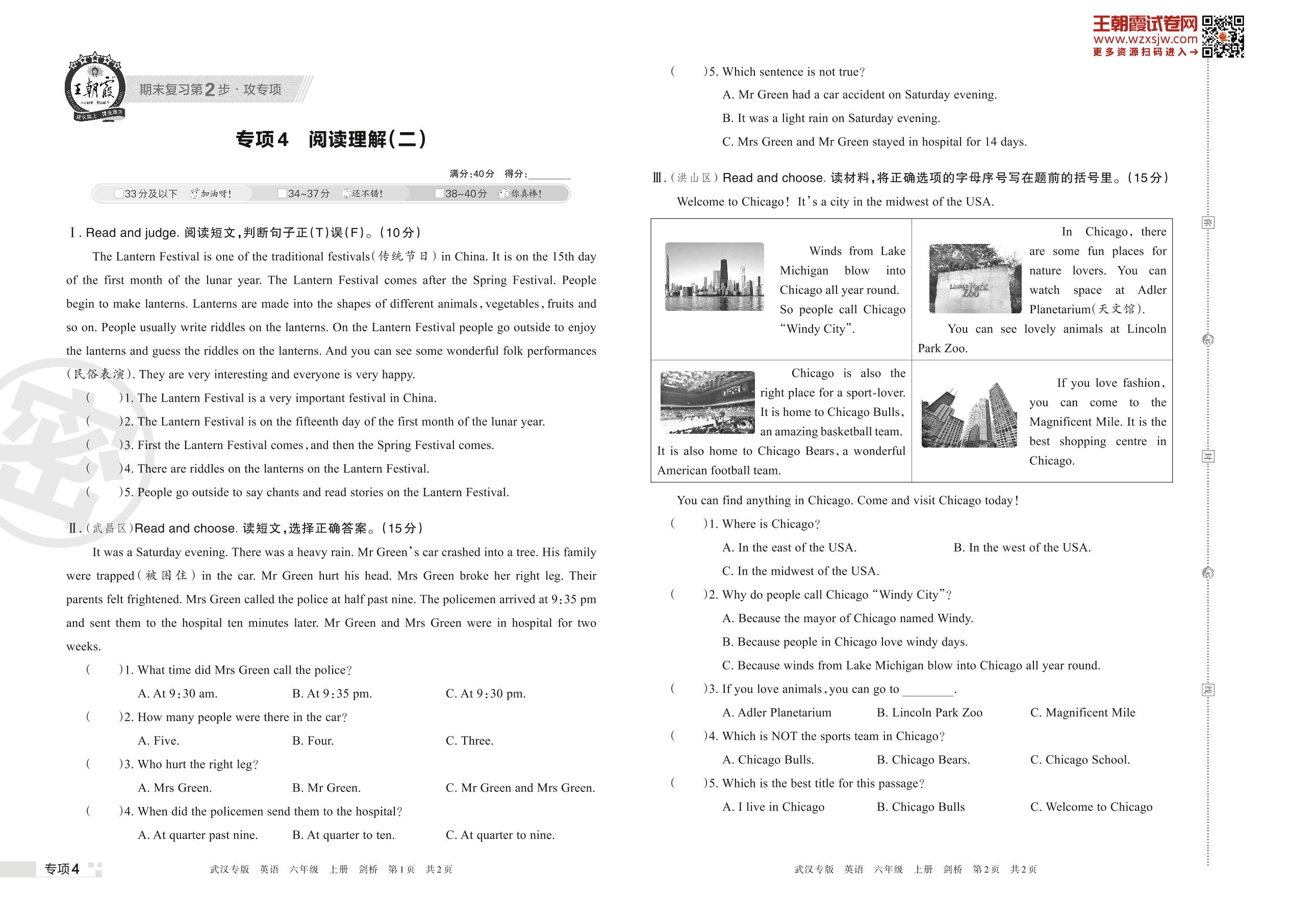 王朝霞期末专项卷——阅读理解(二)六年级上册英语(剑桥版)【4】