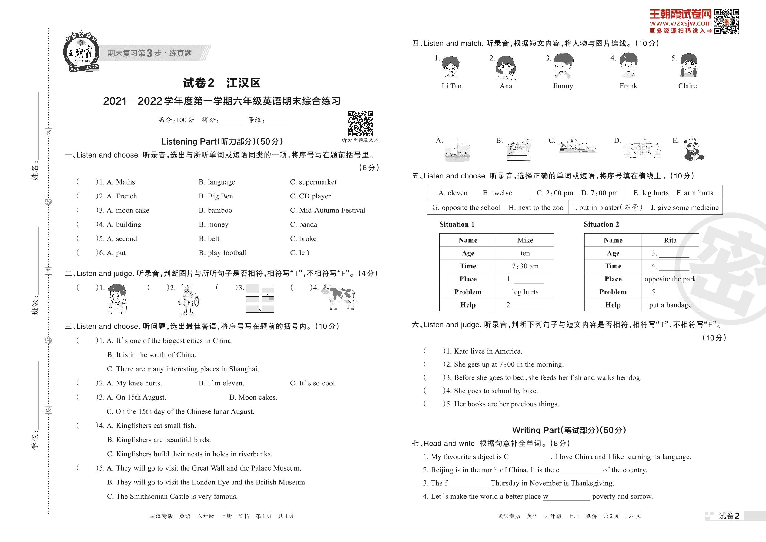 江汉区2021—2022学年度第一学期六年级英语期末综合练习(剑桥版)【2】