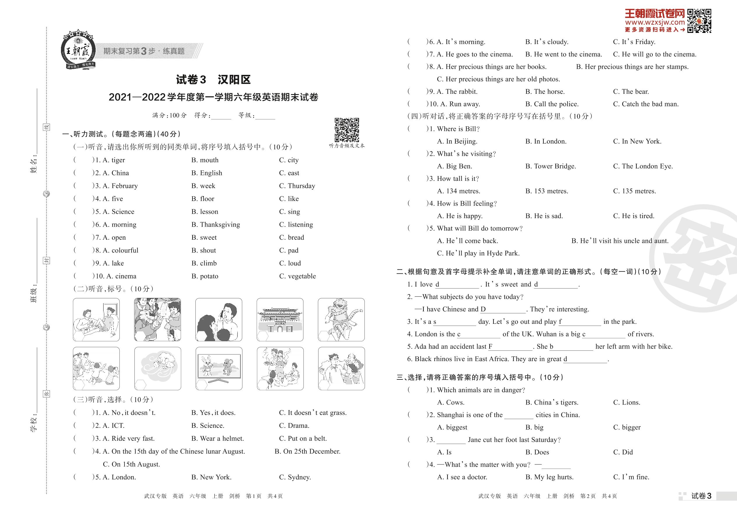 汉阳区2021—2022学年度第一学期六年级英语期末试卷(剑桥版)【3】
