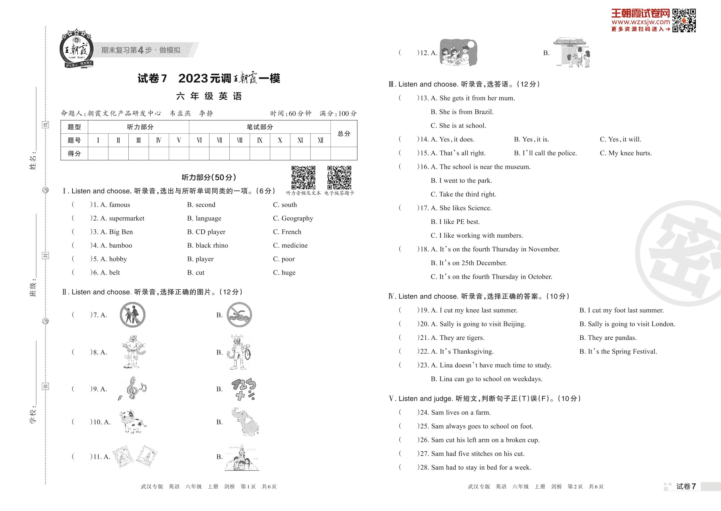 王朝霞元调模拟卷六年级上册英语(剑桥版)【7】