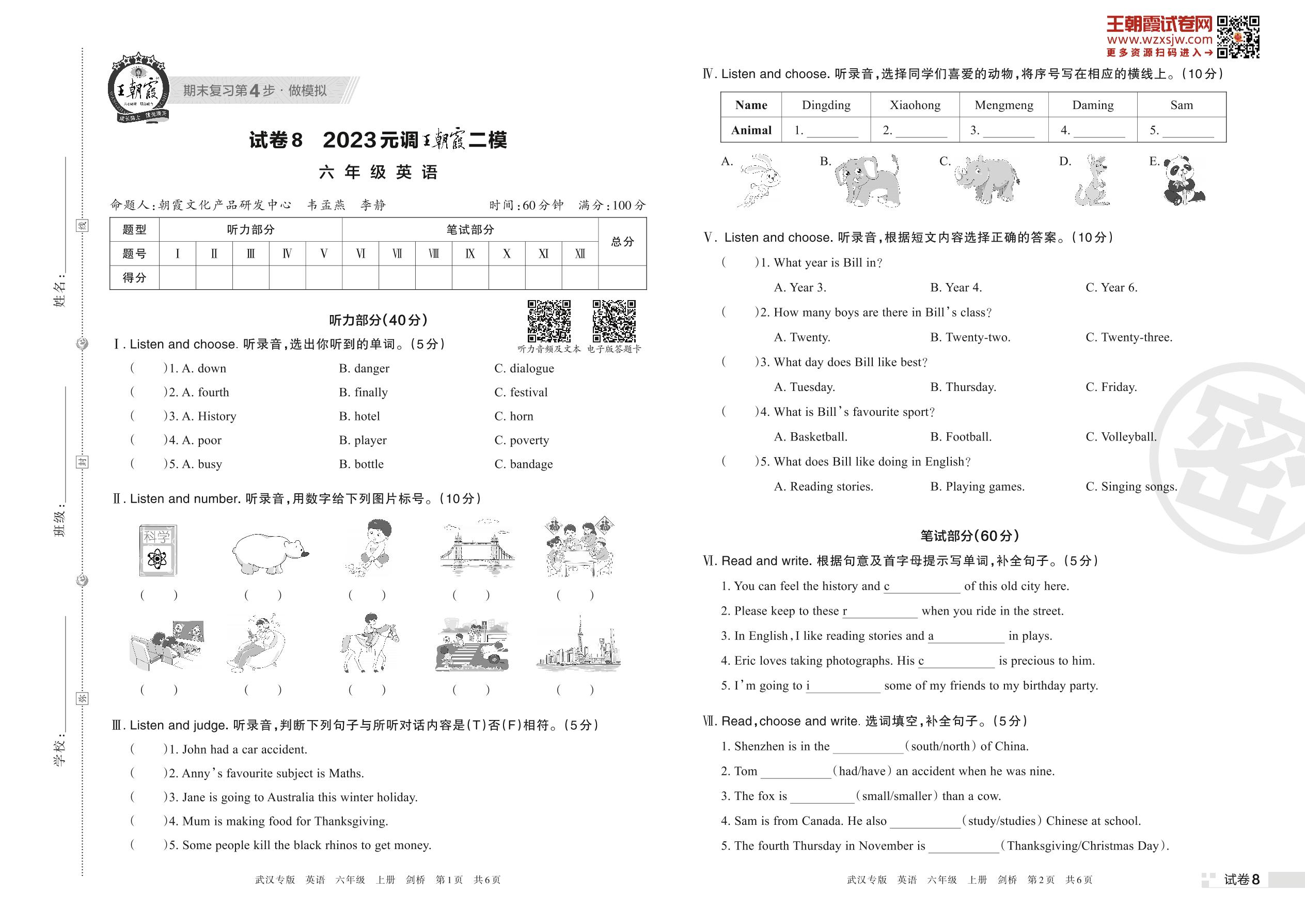 王朝霞元调模拟卷六年级上册英语(剑桥版)【8】