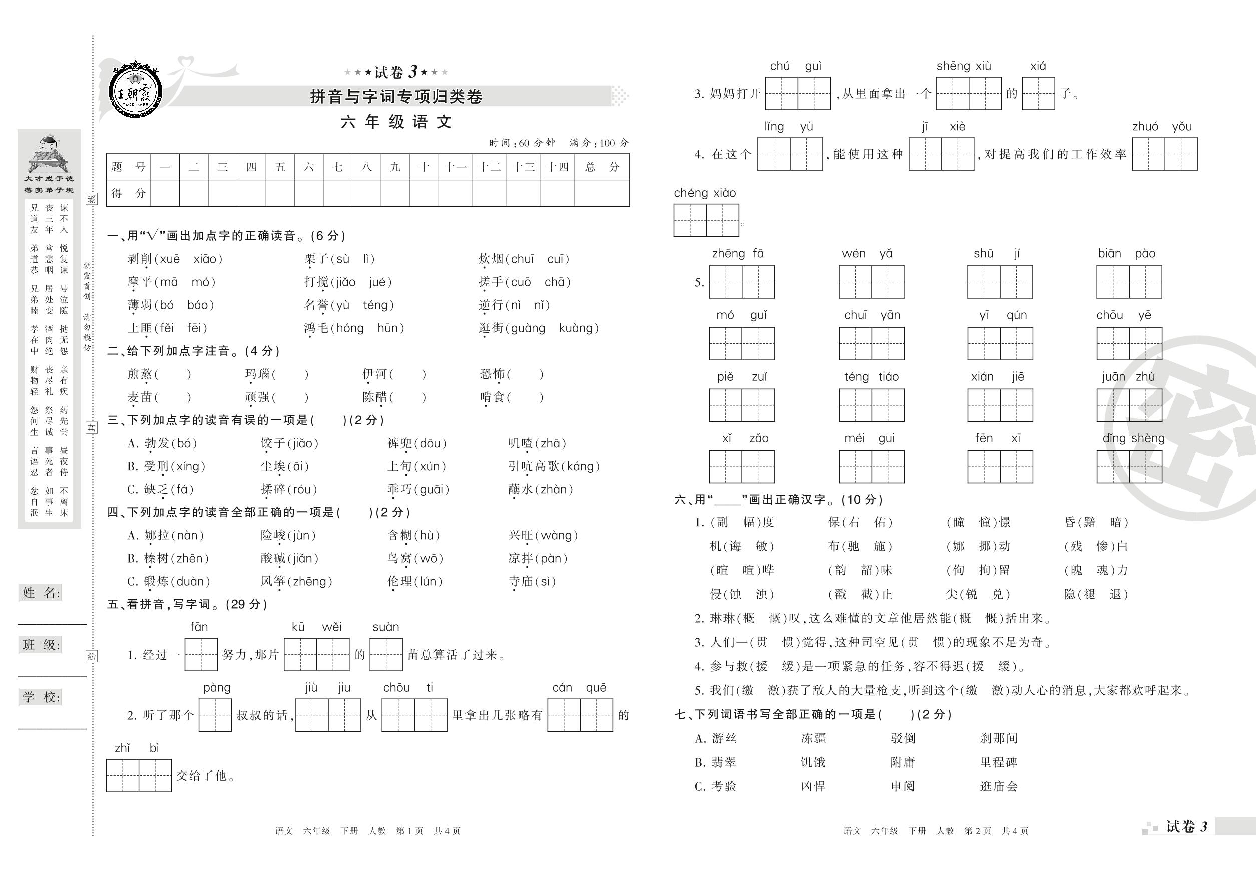 王朝霞期末专项卷——拼音与字词专项归类卷六年级下册语文(人教版)_R210802115754【3】