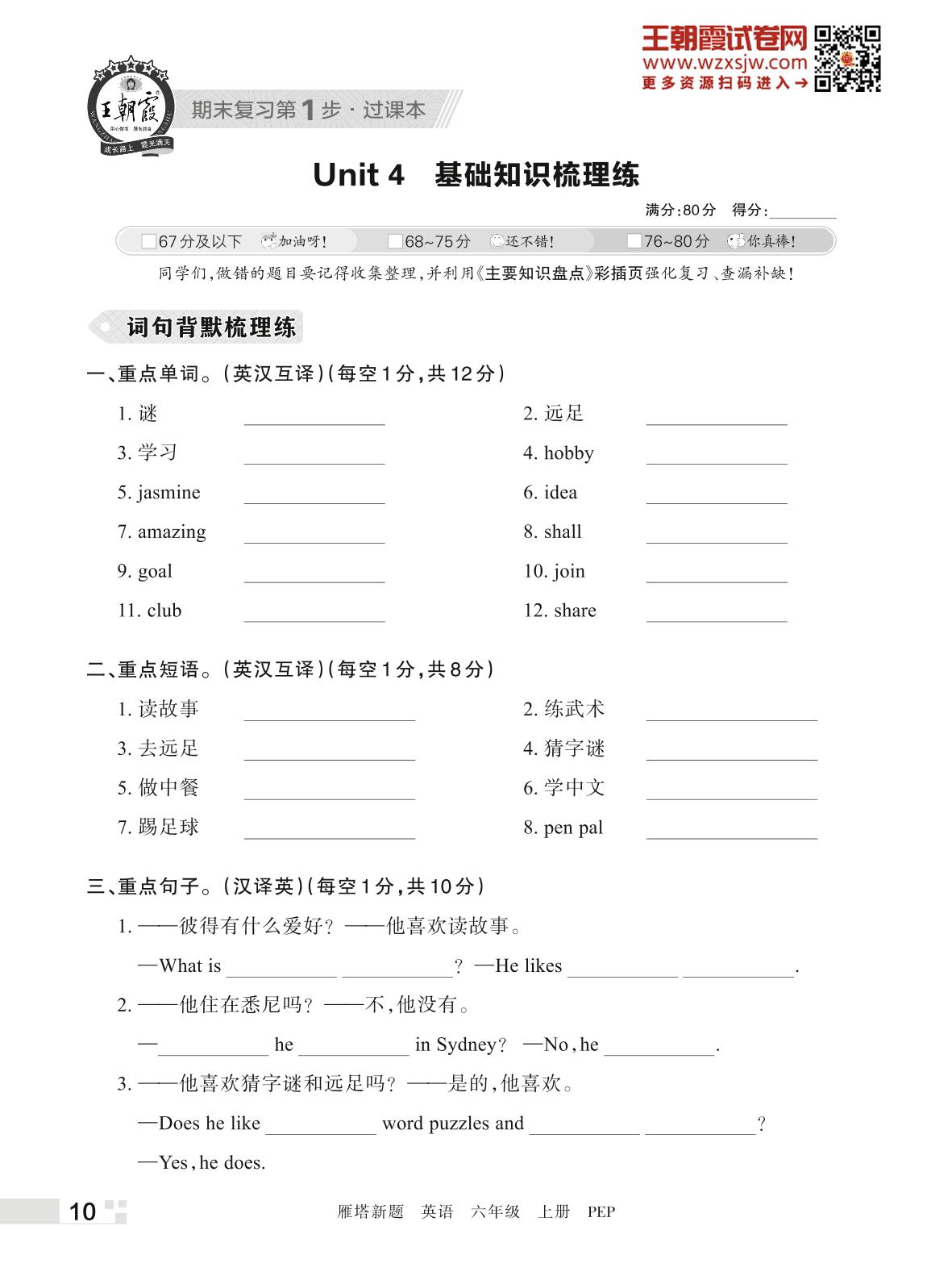 王朝霞期末过课本——Unit 4 基础知识梳理练六年级上册英语(PEP版)_R221123172600494