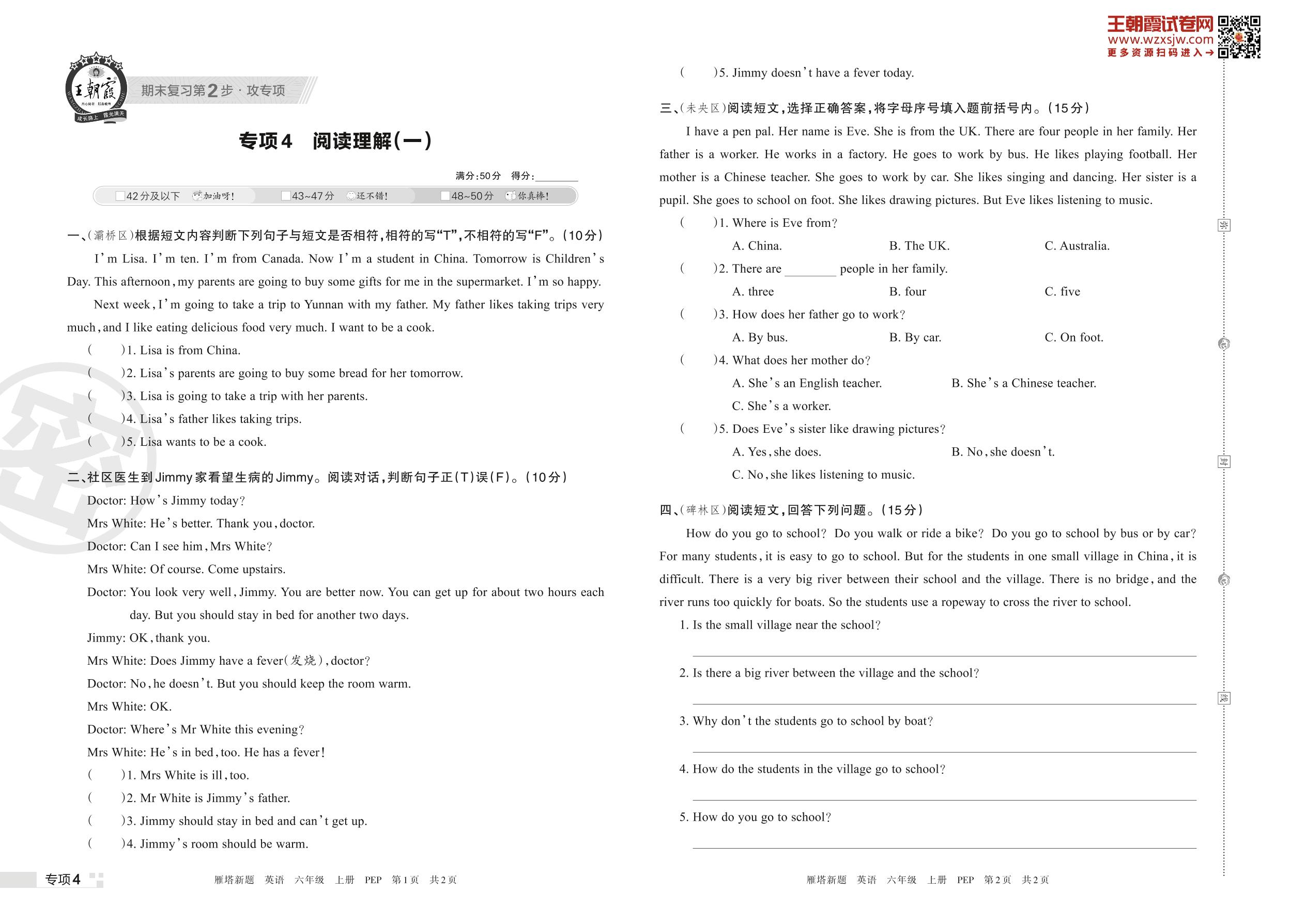 王朝霞期末专项卷——阅读理解(一)六年级上册英语(PEP版)_R221123172601363【4】