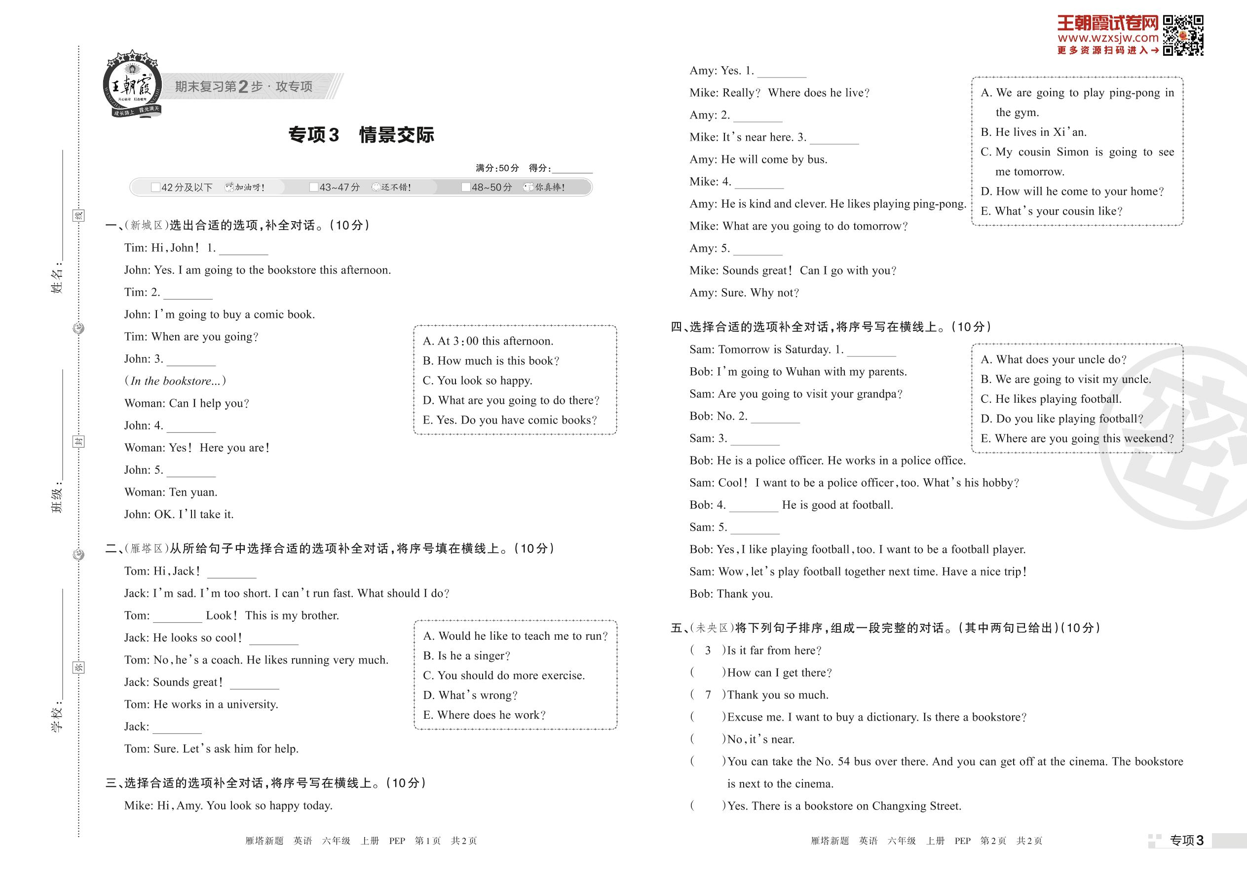 王朝霞期末专项卷——情景交际六年级上册英语(PEP版)【3】
