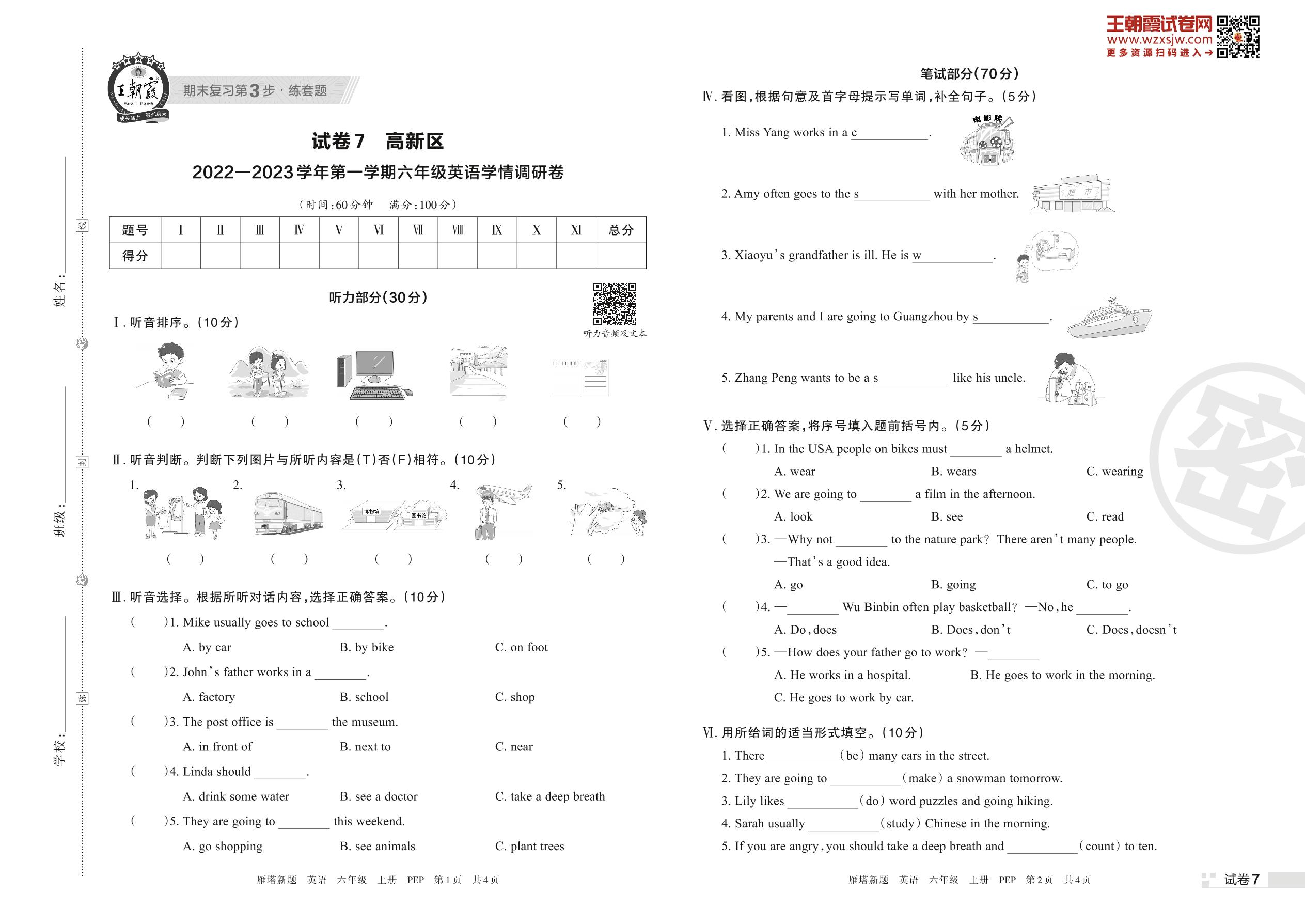 高新区2022—2023学年第一学期学情调研卷六年级上册英语(PEP版)【7】