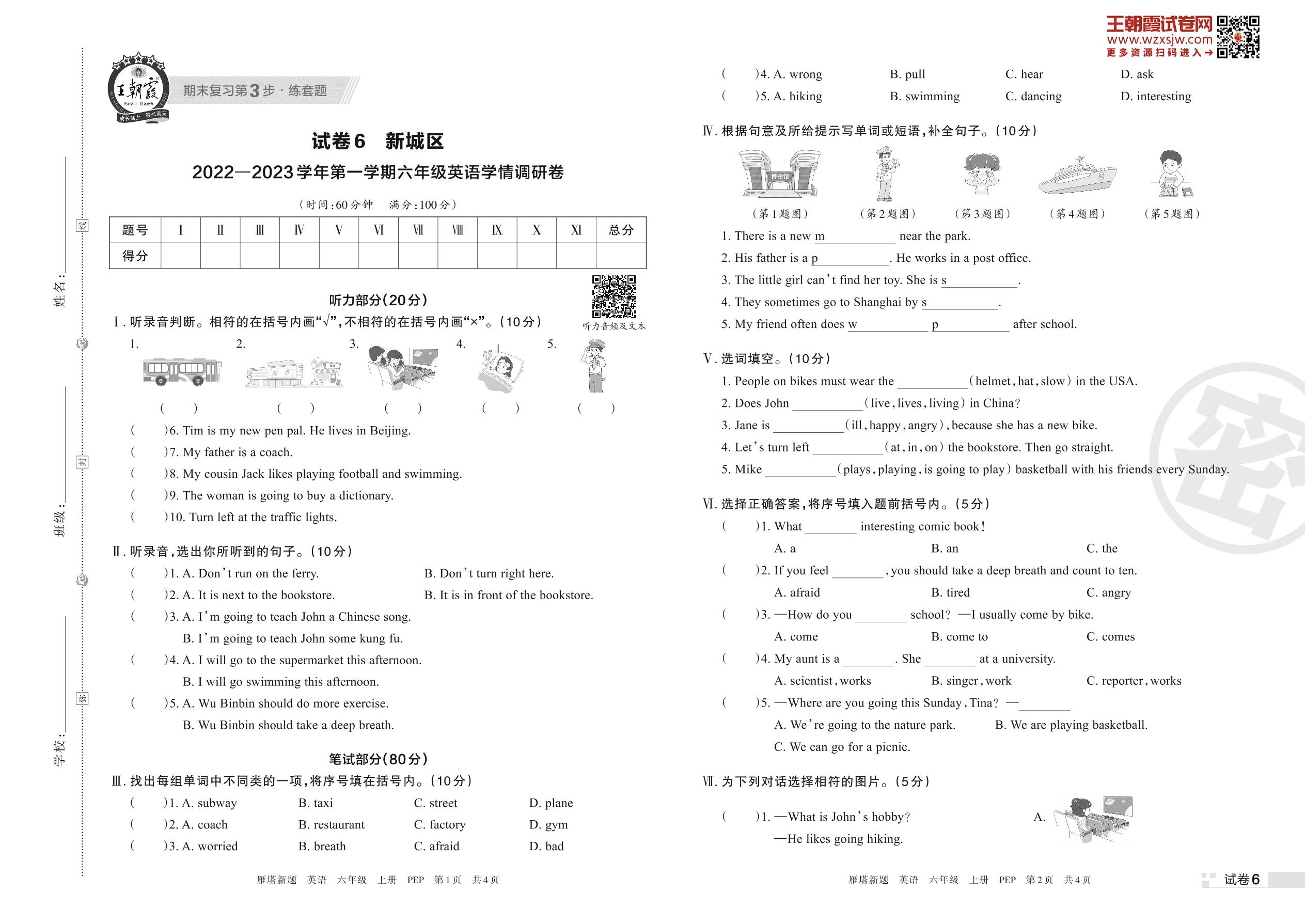 新城区2022—2023学年第一学期学情调研卷六年级上册英语(PEP版)【6】