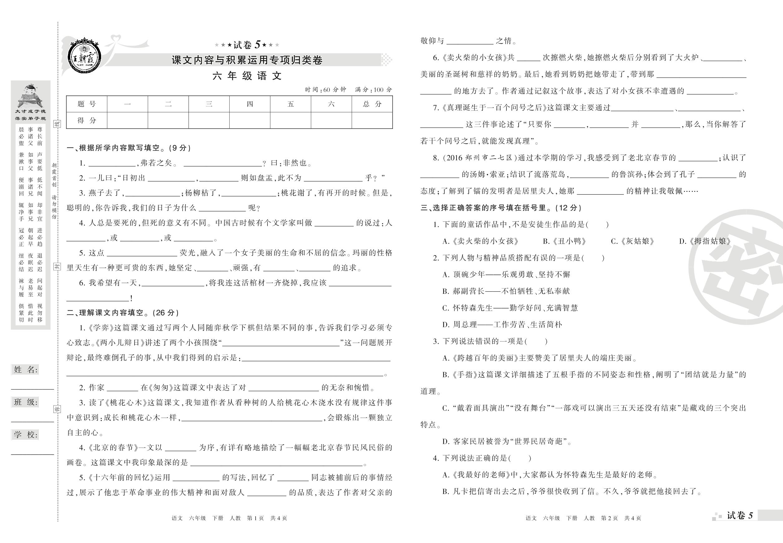 王朝霞期末专项卷——课文内容与积累运用专项归类卷六年级下册语文(人教版)_R210802115803【5】