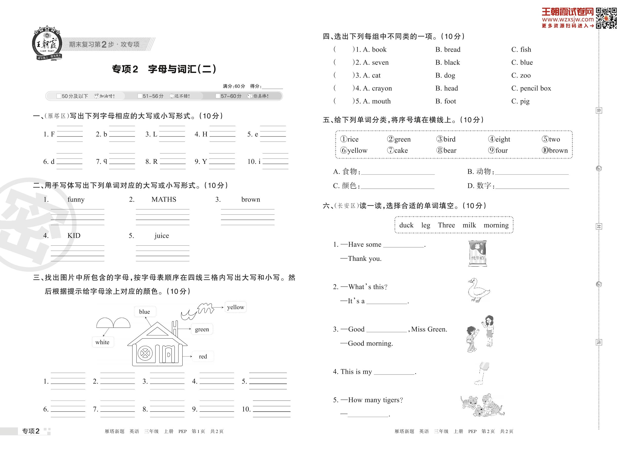 王朝霞期末专项卷——字母与词汇(二)三年级上册英语(PEP版)【2】