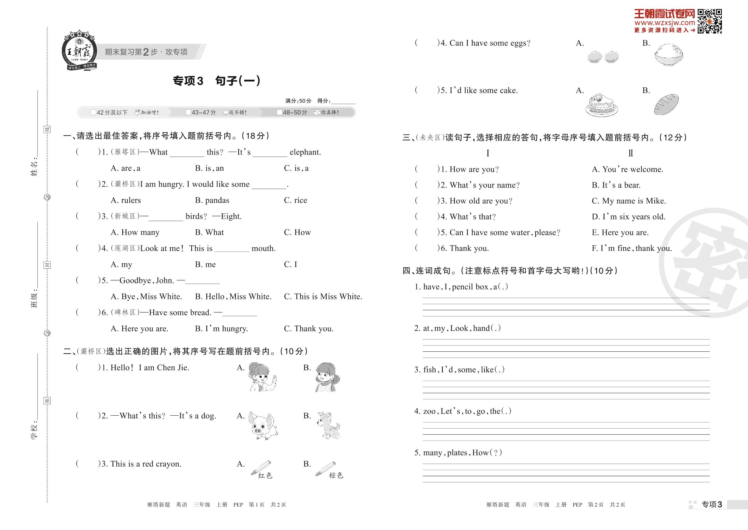 王朝霞期末专项卷——句子(一)三年级上册英语(PEP版)【3】