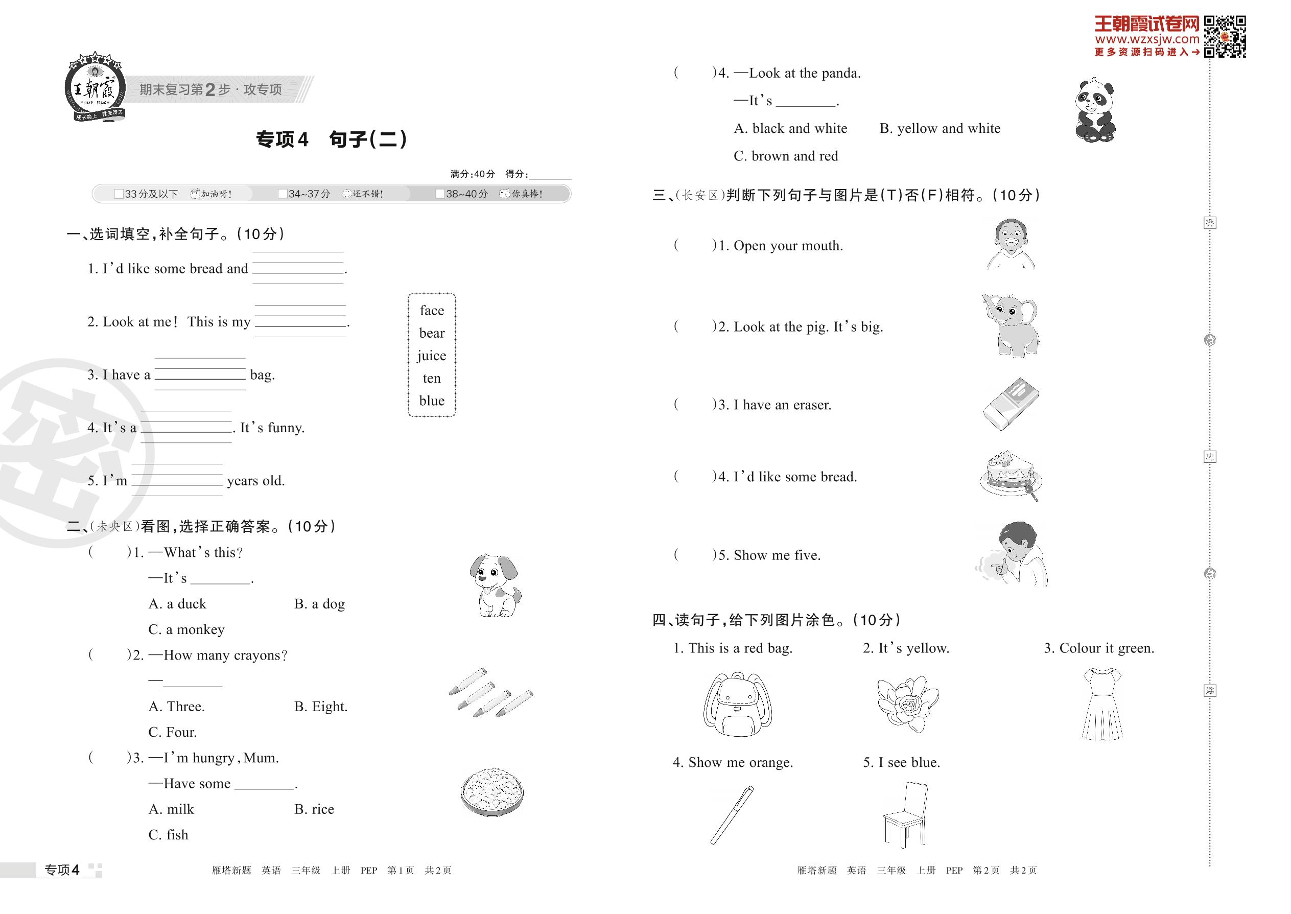 王朝霞期末专项卷——句子(二)三年级上册英语(PEP版)【4】