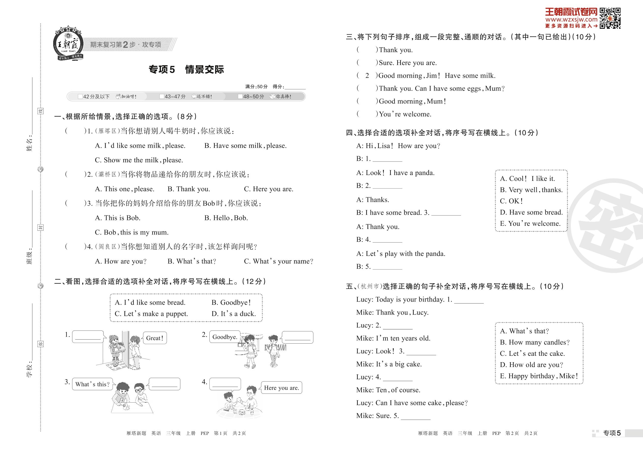 王朝霞期末专项卷——情景交际三年级上册英语(PEP版)【5】
