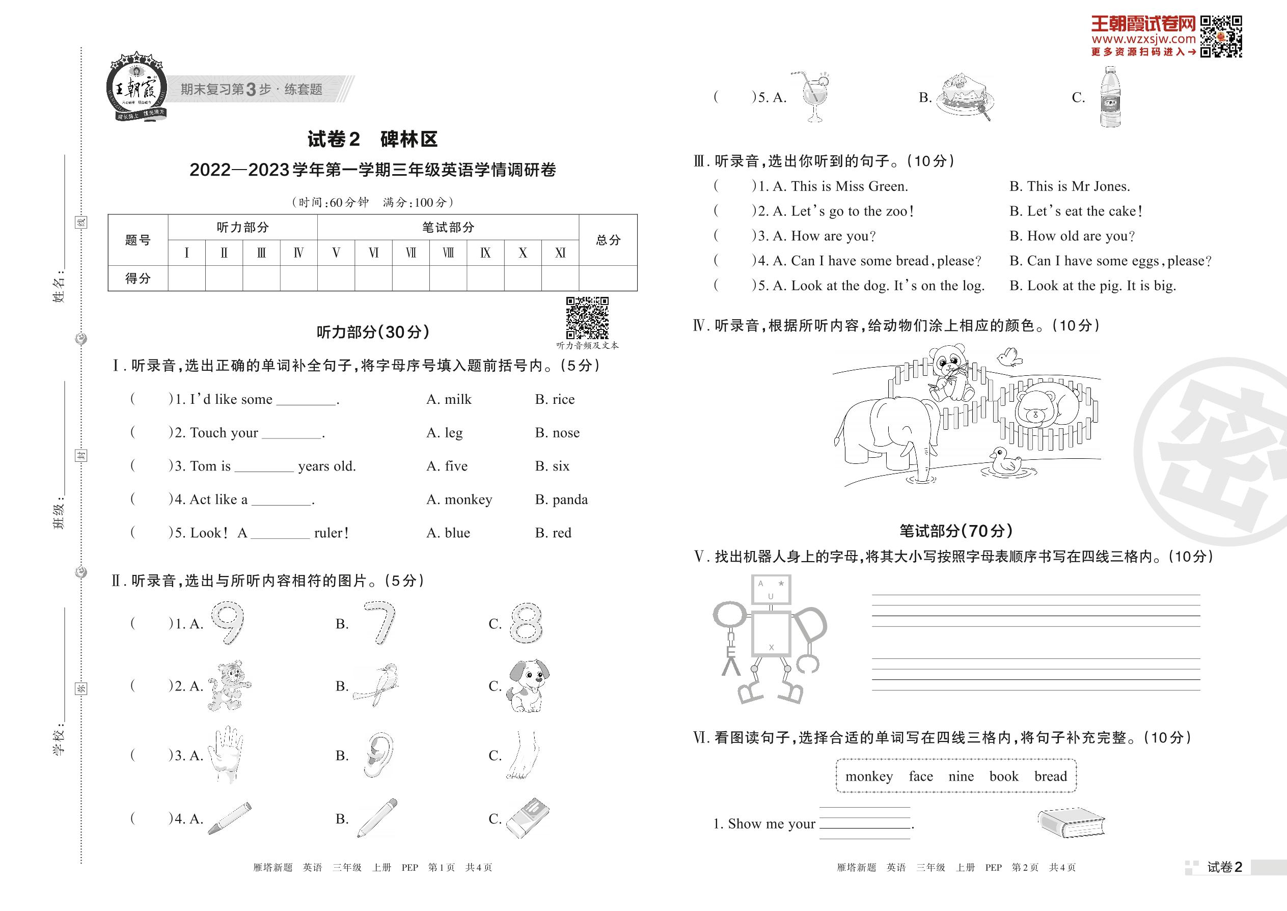 碑林区2022—2023学年第一学期学情调研卷三年级上册英语(PEP版)【2】