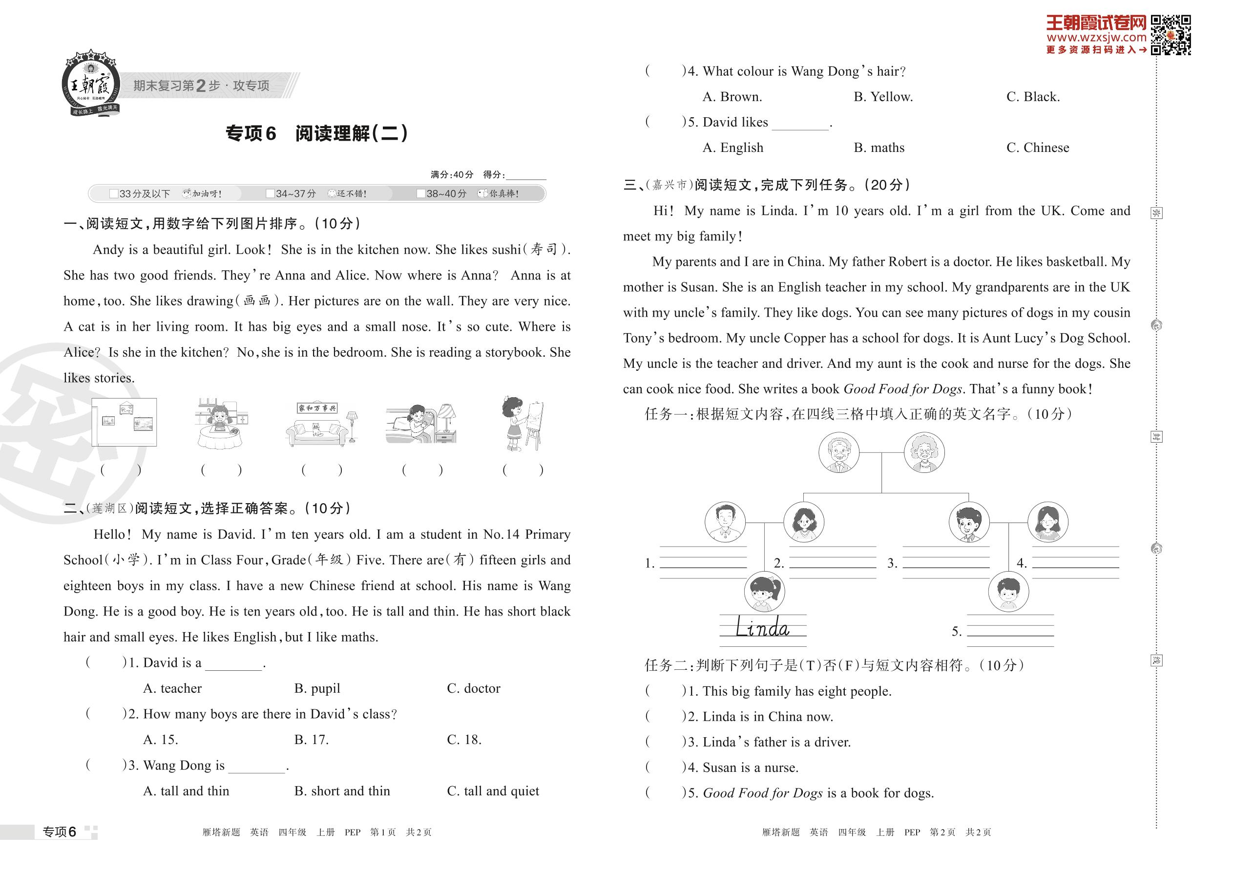 王朝霞期末专项卷——阅读理解(二)四年级上册英语(PEP版)【6】