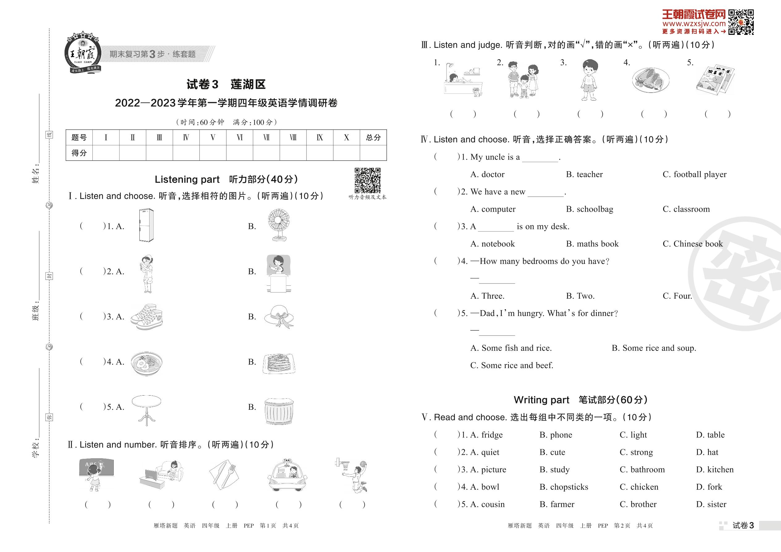 莲湖区2022—2023学年第一学期学情调研卷四年级上册英语(PEP版)【3】