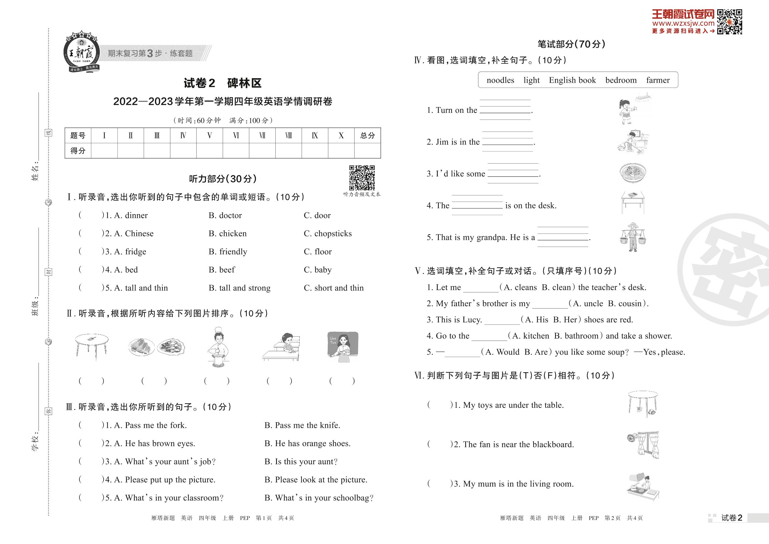 碑林区2022—2023学年第一学期学情调研卷四年级上册英语(PEP版)【2】