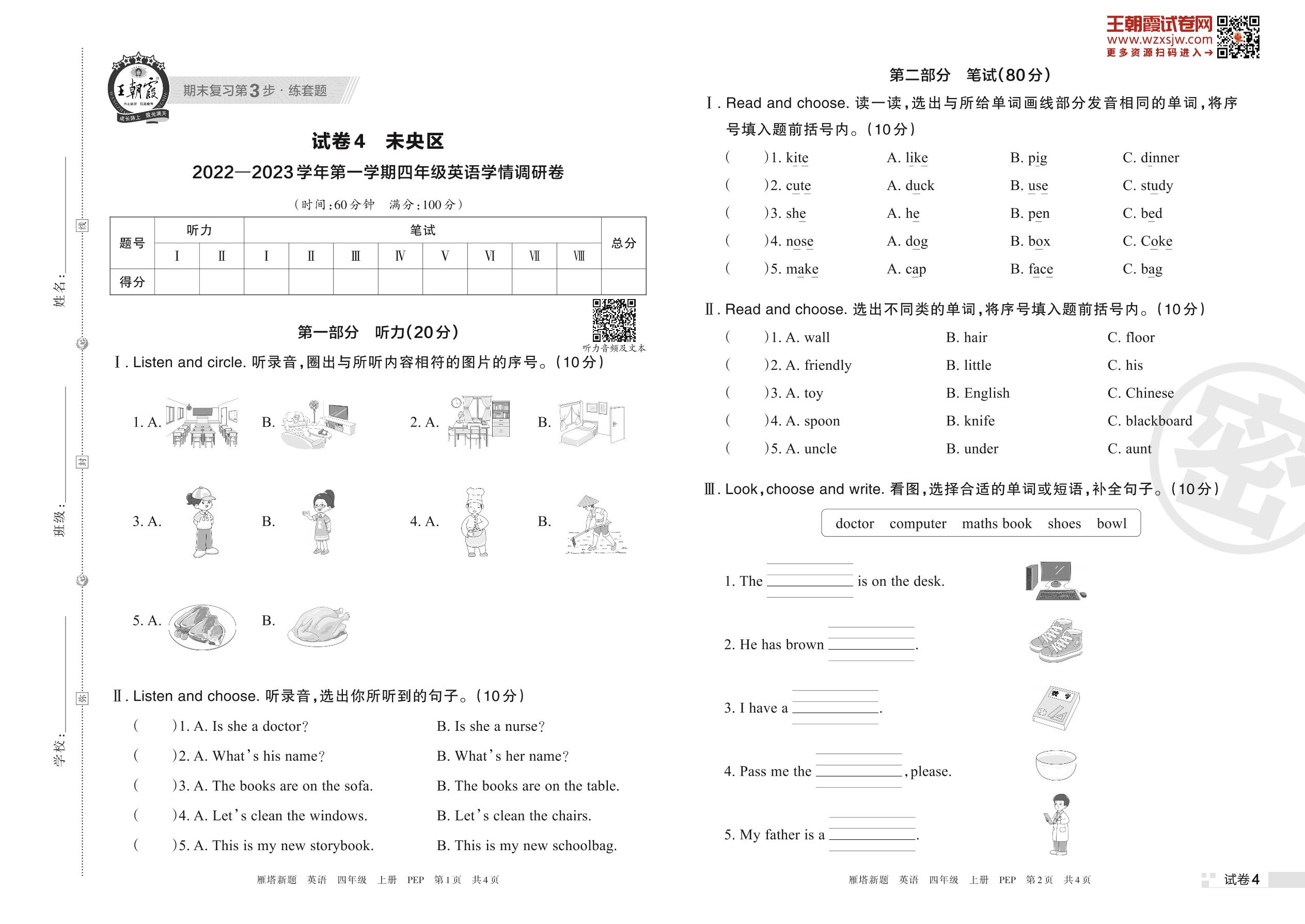 未央区2022—2023学年第一学期学情调研卷四年级上册英语(PEP版)【4】
