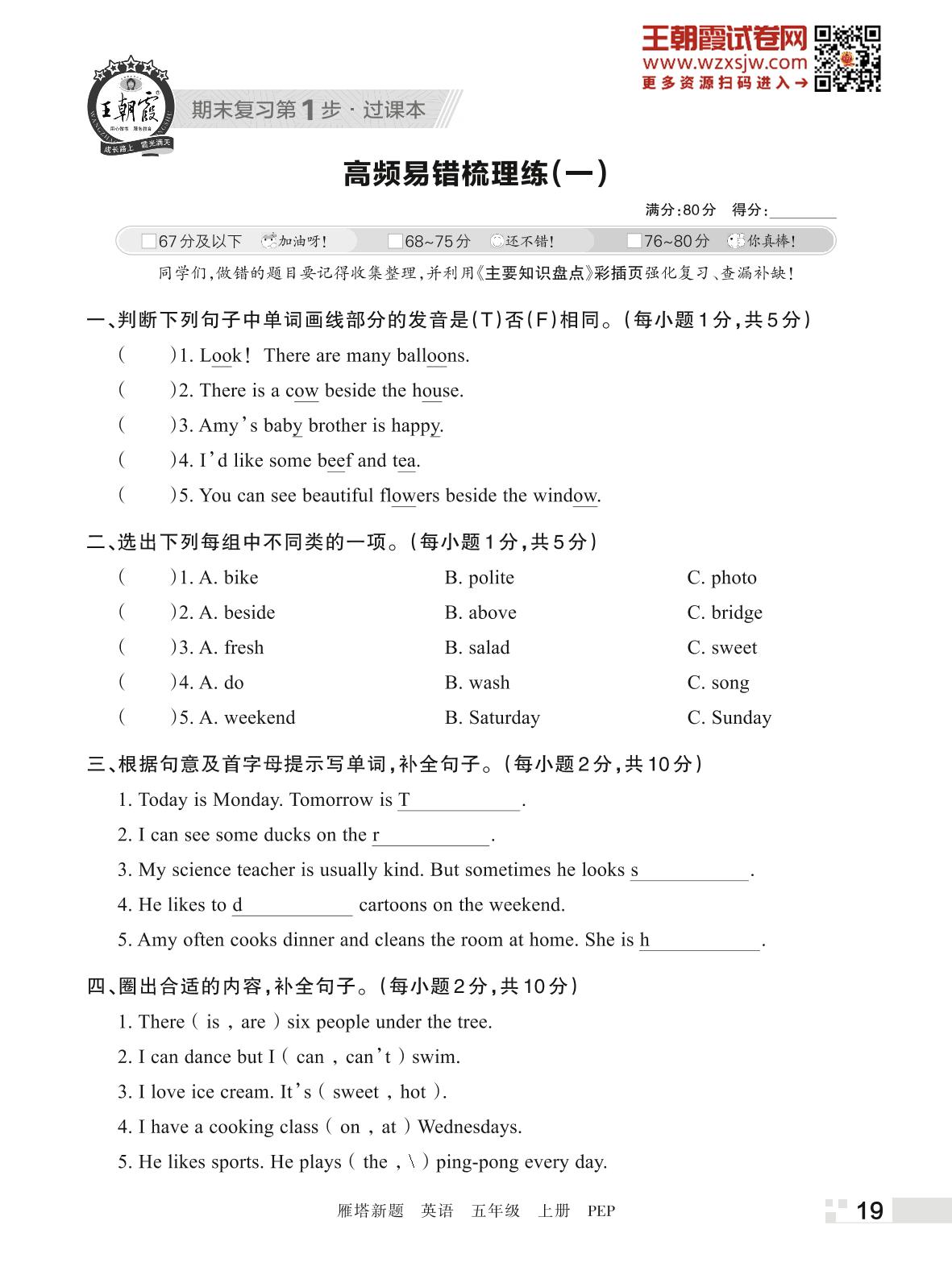 王朝霞期末过课本——高频易错梳理练(一)五年级上册英语(PEP版)_R221123175737505