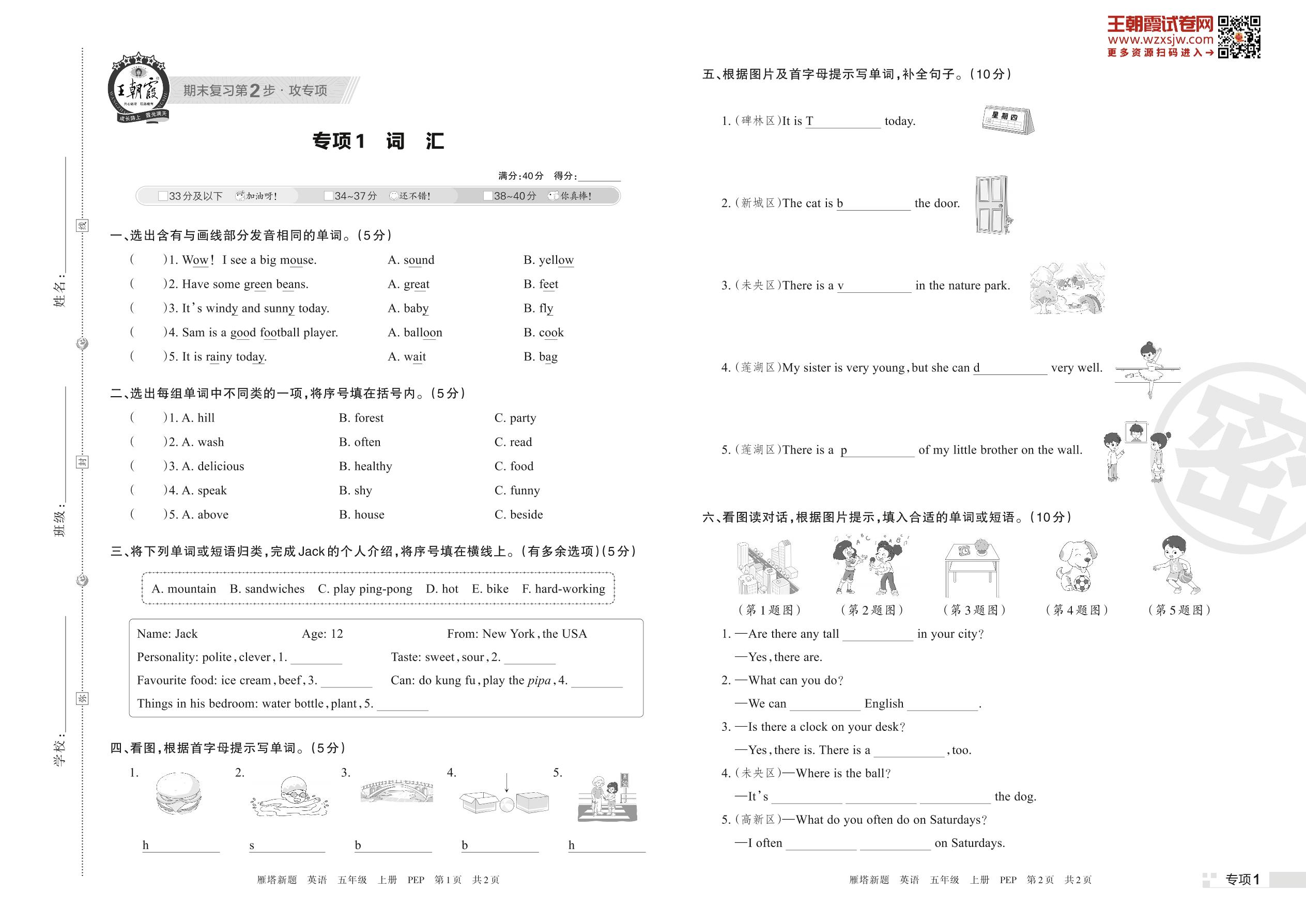 王朝霞期末专项卷——词汇五年级上册英语(PEP版)【1】