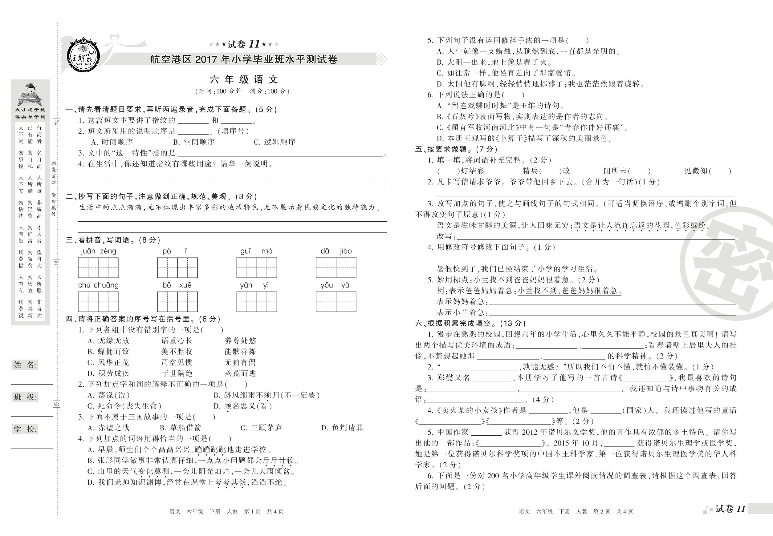2016-2017学年第二学期郑州市航空港区六年级语文试卷(人教版)【11】