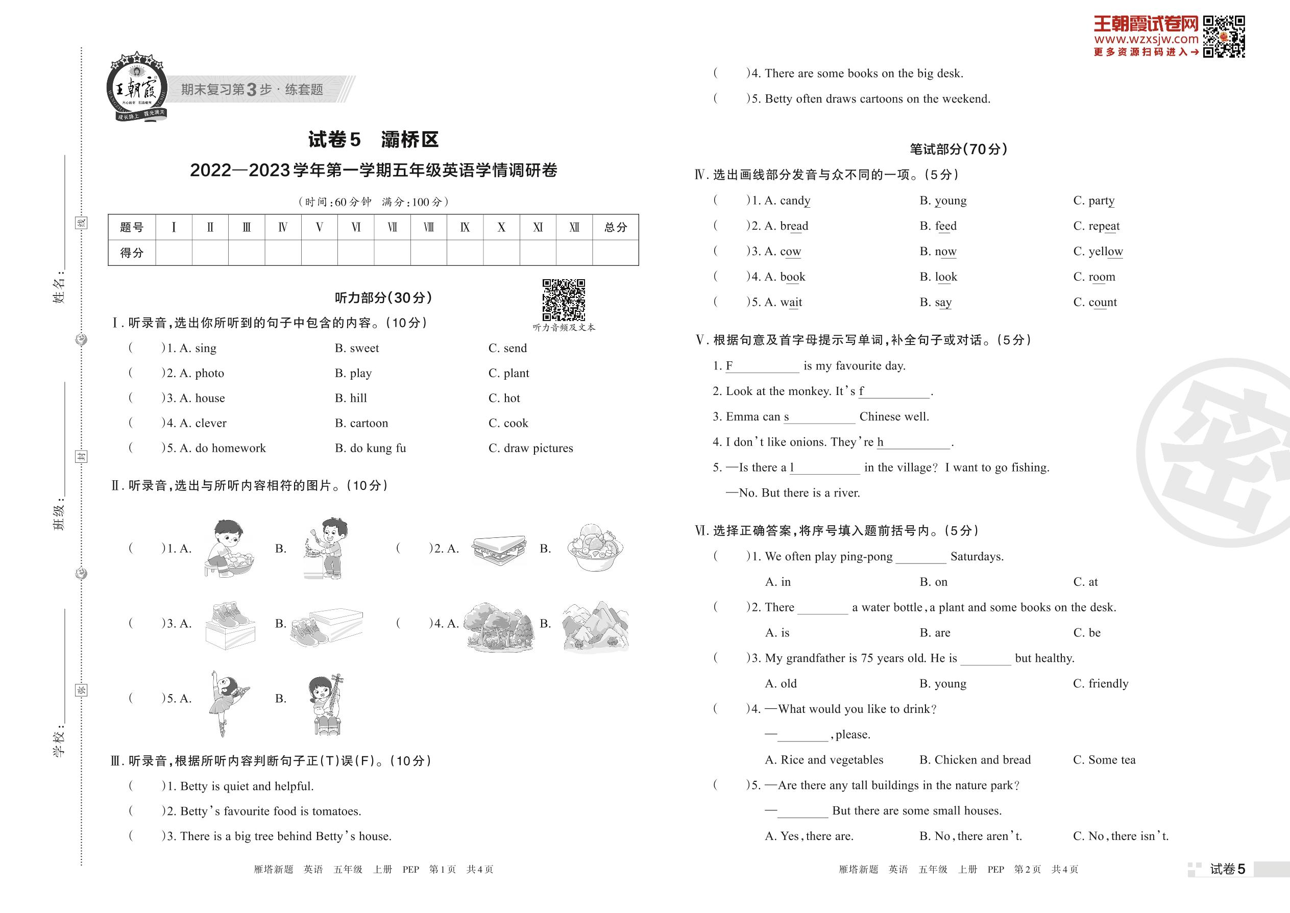 灞桥区2022—2023学年第一学期学情调研卷五年级上册英语(PEP版)【5】