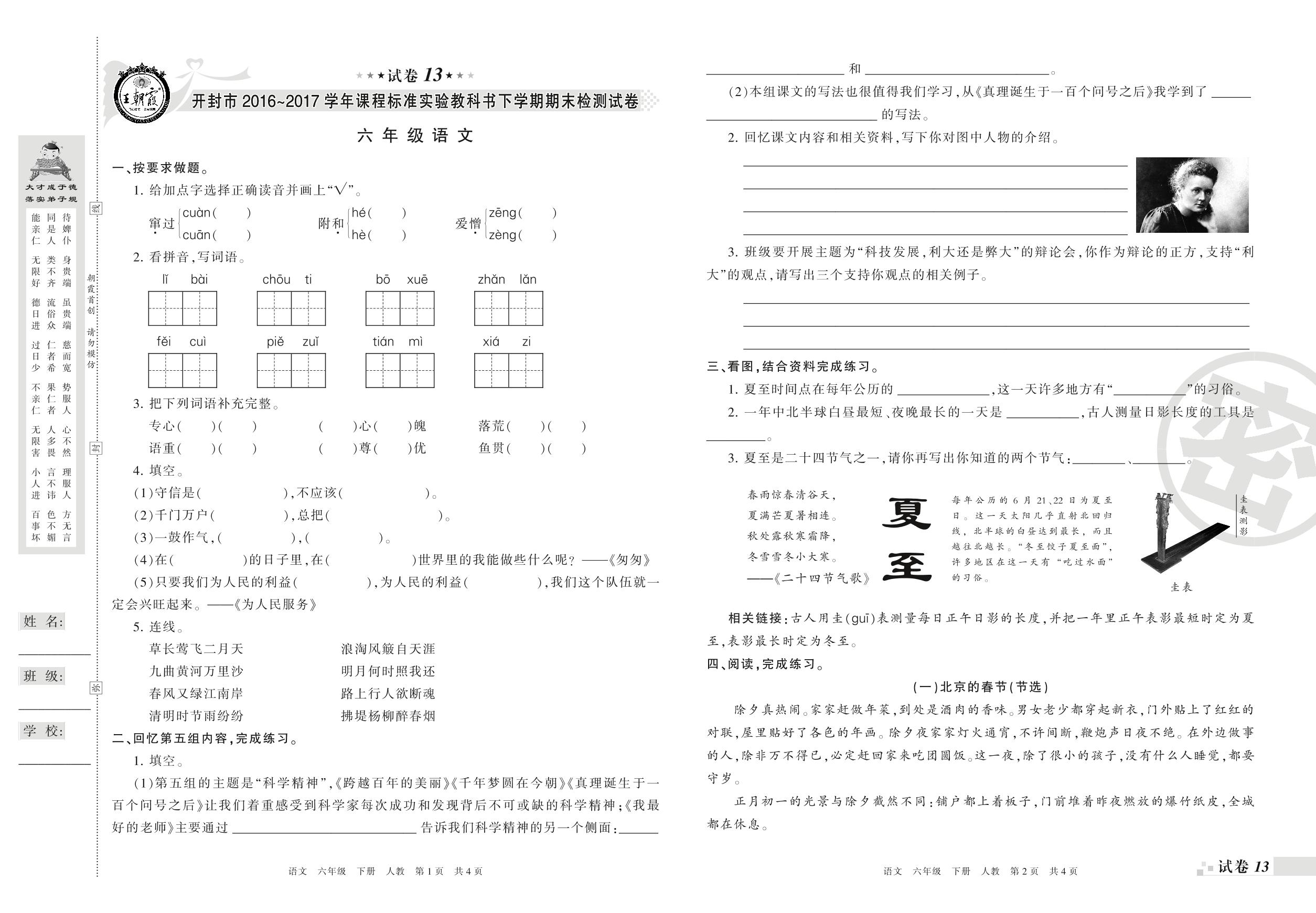 2016-2017学年第二学期开封市六年级语文试卷(人教版)【13】