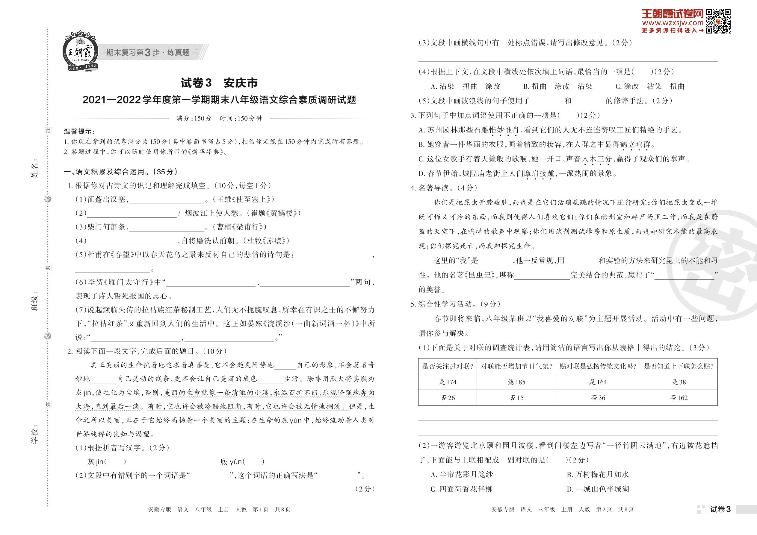 安庆市2021-2022学年度第一学期期末八年级语文综合素质调研试题(人教版)【3】