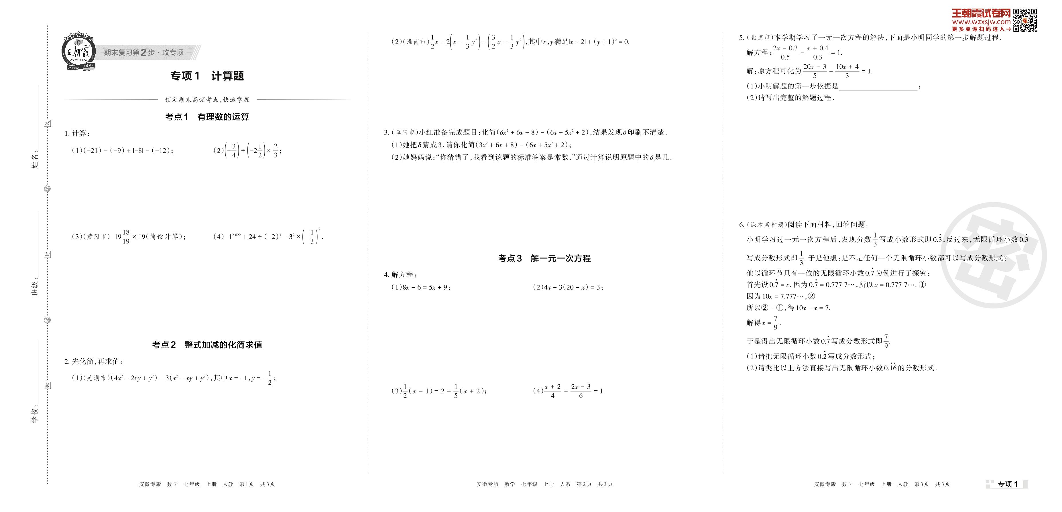 王朝霞期末专项卷——计算题七年级上册数学(人教版)_R221123232313021【1】