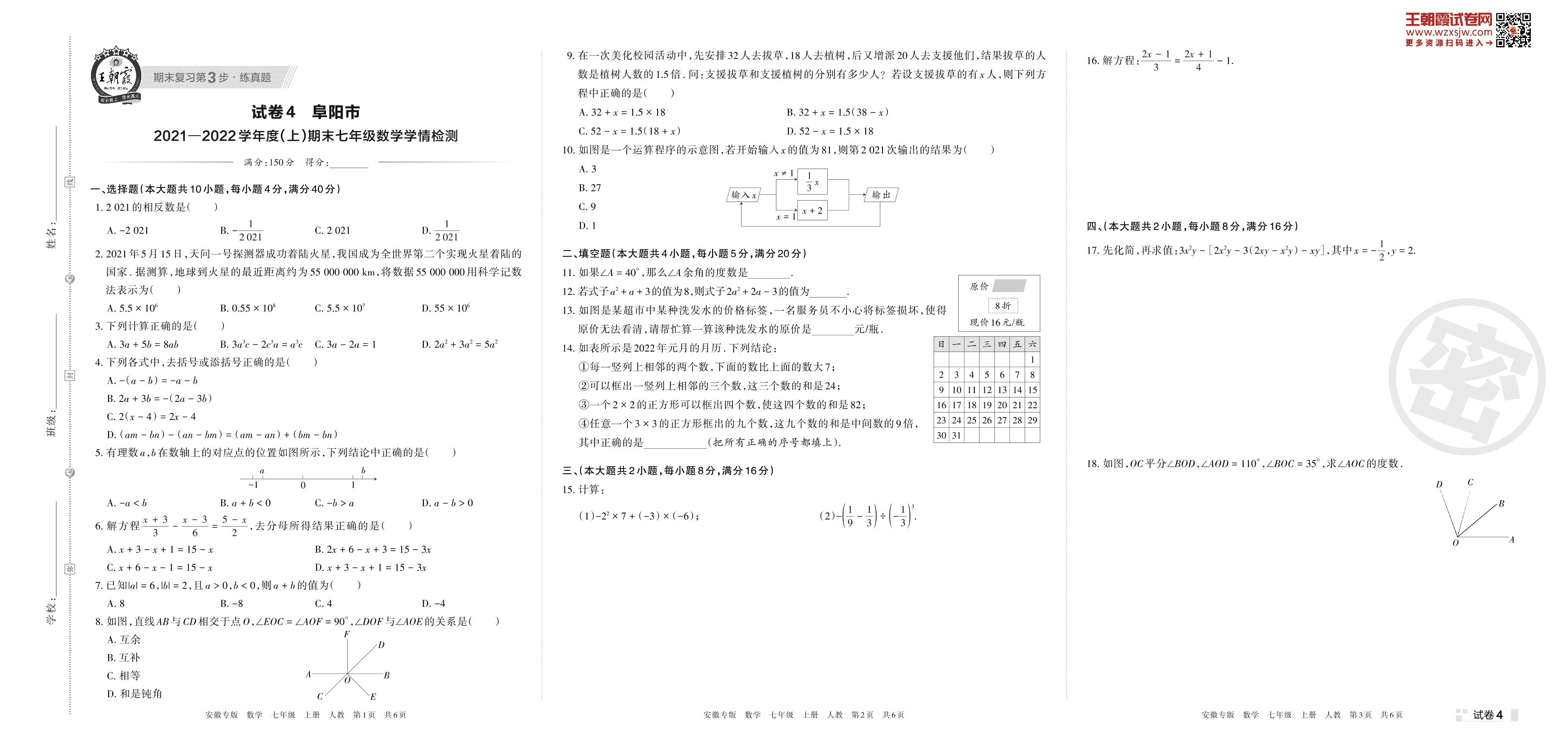 阜阳市2021-2022学年度(上)期末七年级数学学情检测(人教版)【4】