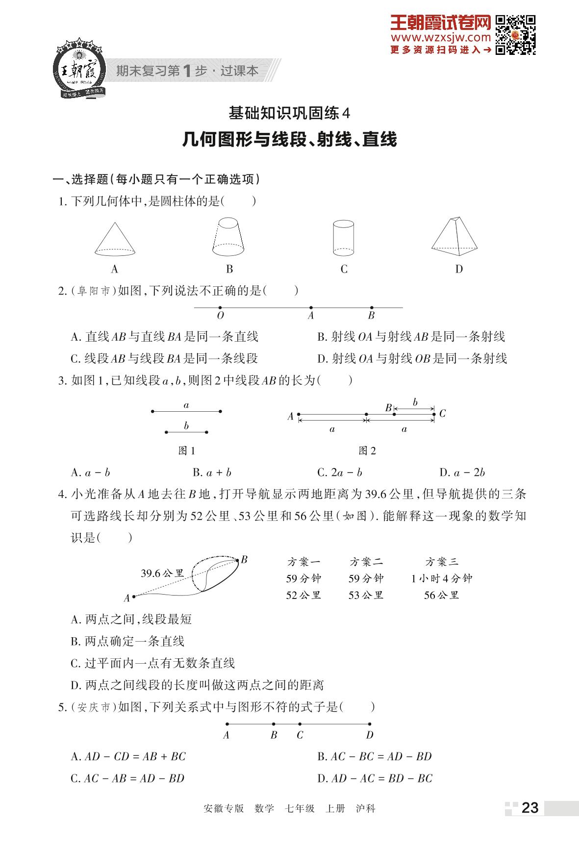 王朝霞期末过课本——基础知识巩固练4 几何图形与线段、射线、直线七年级上册数学(沪科版)