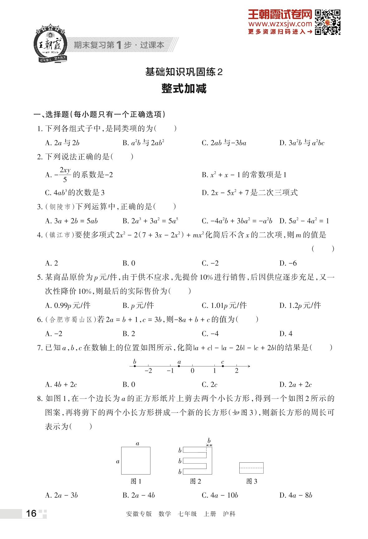 王朝霞期末过课本——基础知识巩固练2 整式加减七年级上册数学(沪科版)